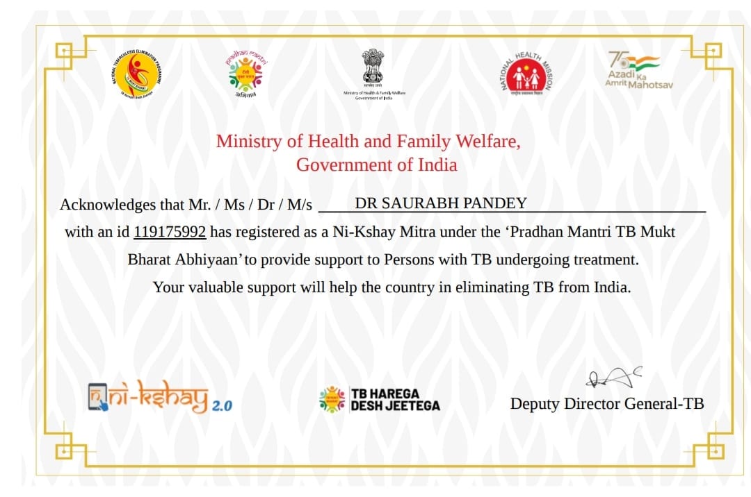 क्षय रोग के उन्मूलन मे उल्लेखनीय योगदान के लिए केन्द्रीय स्वास्थ्य और परिवार कल्याण मंत्रालय द्वारा डॉ. सौरभ पाण्डेय की की गई सराहना।