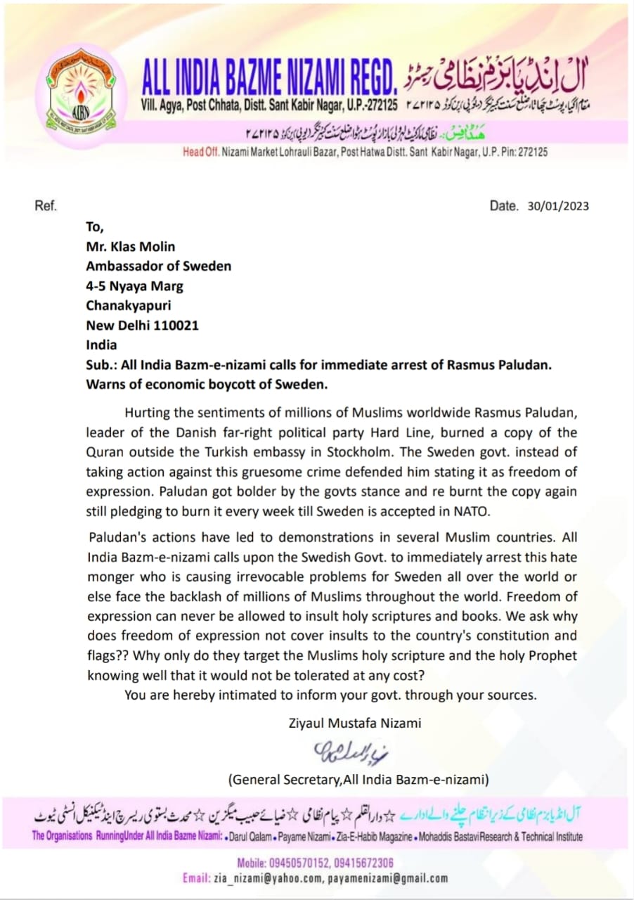 मौलाना जियाउल मुस्तफा निजामी महासचिव आल इंडिया बज्मे निजामी ने दिल्ली में स्वीडिश राजदूत श्री क्लास मुलेन को एक ज्ञापन भेजकर स्वीडन में पवित्र कुरान के अपमान पर रोष व्यक्त किया है।