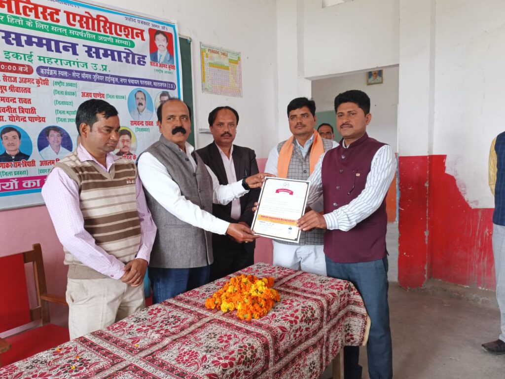 महराजगंज जिले के नगर पंचायत परतावल सेंट थॉमस जूनियर हाईस्कूल में इंडियन जर्नलिस्ट एसोसिएशन महराजगंज इकाई के तत्वावधान में बैठक एवं पत्रकार सम्मान समारोह हुआ सम्पन्न। सम्मान समारोह के मुख्य अतिथि संगठन के राष्ट्रीय अध्यक्ष सेराज अहमद कुरैशी, विशिष्ट अतिथि काशीनाथ सिंह पूर्व सांसद प्रतिनिधि एवं अनूप श्रीवास्तव जिला संरक्षक रहे कार्यक्रम की अध्यक्षता जिलाध्यक्ष रामचन्द्र रावत व संचालन जिला महासचिव नवनीत त्रिपाठी ने किया ।