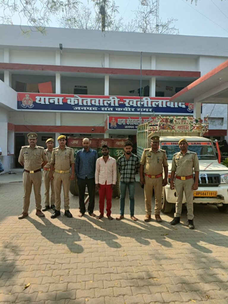 जनपद में चोरी / छिनैती जैसी घटनाओं के सफल अनावरण हेतु प्रभारी निरीक्षक को0 खलीलाबाद सर्वेश राय के नेतृत्व में गठित टीम द्वारा आज दिनॉक 12.03.2023 को मुखबिर की सूचना पर बरईपार ईंट भट्ठे के पास से पिकअप वाहन नं0 UP58AT1912 से ट्रैक्टर ट्राली चोरी करने के उद्देश्य से रेकी करते समय 02 अभियुक्तगण नाम पता 1- सचिन यादव S/O संतोष यादव R/O तिलाठी थाना बखिरा जनपद संतकबीरनगर (ड्राइवर) 2- विनय S/O रामलुटावन R/O तिलाठी थाना बखिरा जनपद संतकबीरनगर को गिरफ्तार किया गया तथा उक्त दोनों गिरफ्तारशुदा अभियुक्तों की निशानदेही पर ग्राम डडवा से 01 अदद चोरी की ट्राली के साथ जमाल हसन S/O अनावरुल हसन R/O डड़वा पो0 भुजैनी थाना कोतवाली खलीलाबाद को गिरफ्तार किया गया ।