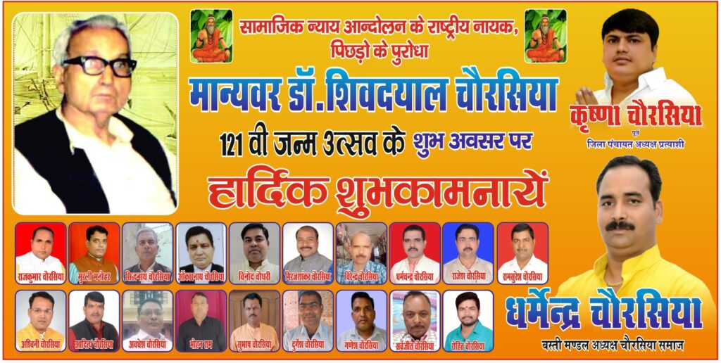 13 मार्च 2023 दिन सोमवार को समय सुबह 11:00 बजे, स्थान चौरसिया पुरम कालोनी (रोडवेज बाईपास से 100 मीटर पूरब) मोहद्दीपुर रोड खलीलाबाद संत कबीर नगर में सामाजिक न्याय आन्दोलन के राष्ट्रीय नायक, पिछड़ो के पुरोधा, वरिष्ठ सदस्य काका कालेलकर आयोग, पूर्व सांसद राज्यसभा बाबू शिवदयाल सिंह चौरसिया का जन्म दिवस भव्य तरीके से मनाने व शोभा यात्रा रथ एवं बाइक रैली निकालकर अपना अमूल्य समय देकर बाबू शिवदयाल सिंह चौरसिया की जयंती समारोह में अपनी उपस्थिति देकर चौरसिया समाज के गौरव को बढ़ाने के लिए आप सभी लोग अधिक से अधिक संख्या में बाइक लेकर बाइक रैली में शामिल हो|