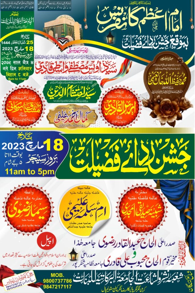 दिनांक 18.03.23 को अलजामिअतुल बरकातिया लिलबनात,रजा नगर कृष्णा नगर जनपद कपिलवसतु नेपाल मे एक दिवसीय जशने इमामे आजम और जशने रिदाए फजीलत का आयोजन किया जा रहा है,इस जश्न की सरपरस्ती आले रसूल,गुले गुलजारे सियादत हजरत सय्यद उवैस मियां साहब और सदारत हजरत सय्यद एहतेशामुददीन साहब फरमाऐंगे। मेहमान खुसुसी हजरत मुफ्ती हफीजुललाह खान नईमी साहब करेगे।मौलाना अजहरुल कादरी साहब संचालन करेंगे।खुसुसी खिताब मौलाना कमाल अलीमी साहब का होगा।