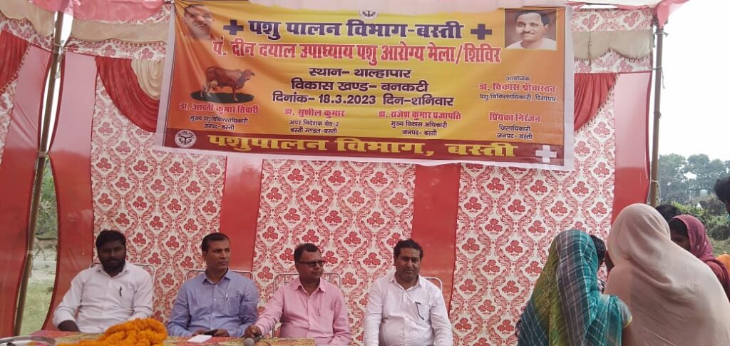 बस्ती, बनकटी……शनिवार को बनकटी ब्लॉक के ग्राम पंचायत थाल्हापार मे पंडित दीनदयाल उपाध्याय पशु आरोग्य मेले का आयोजन किया गया। इस शिविर में आए हुए सभी पशुपालकों को गोष्टी के माध्यम से डॉ0 विकास श्रीवास्तव ने पशुओं के बीमारियों,उनके रखरखाव के बारे में विस्तृत जानकारी दिया।पशुधन प्रसार अधिकारी सुशील कुमार शुक्ल ने पशुपालन पर किसान क्रेडिट कार्ड की सुविधा कैसे प्राप्त करें,पशुधन बीमा तथा वर्ष भर हरे चारे की उपलब्धता के बारे में जानकारी दिया। डॉ0 प्रशांत कुमार ने पशु महामारी से बचाव तथा पशुओं के टीकाकरण से होने वाले लाभ एवं संतुलित आहार की जानकारी दी गई। इस मेले में आए हुए सभी पशुओं को कृमि नाशक दवापान,आइबर मैकटिंग इंजेक्शन,गर्भ परीक्षण एवं दवा वितरण किया गया l
