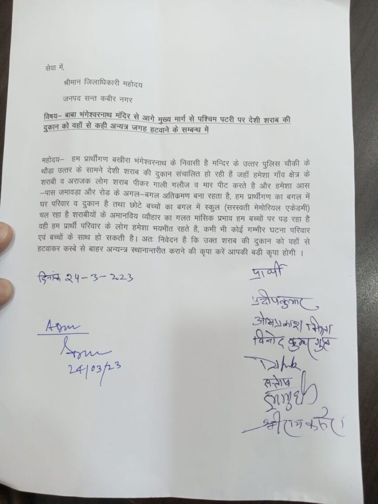 नगर पंचायत बखिरा के अन्तर्गत भंगेश्वरनाथ मन्दिर के निवासी प्रदीप कुमार औम प्रकाश मिश्र विनोद कुमार गुप्ता बुनकर सभा के जिलाध्यक्ष सपा नेता हाजी इमामुददीन अन्सारी ने कहा कि मन्दिर के उत्तर पुलिस चौकी के थौड़ा उत्तर के सामने देशी शराब की दुकान संचालित हो रही हैं जहाँ हमेशा गाँव क्षेत्र के शराबी व अराजक लोग शराब पीकर गाली गलौज व मार पीट करते है और हमेशा आस – पास जमावड़ा और रोड के अगल-बगल अतिक्रमण बना रहता है, बगल में घर परिवार व दुकान है तथा छोटे बच्चों का बगल में स्कुल (सरस्वती मेमोरियल एकेडमी) चल रहा है शराबीयों के अमानविय व्यौहार का गलत मासिक प्रभाव हम बच्चों पर पड़ रहा है वही लोग हमेशा भयभीत रहते है, कभी भी कोई गम्भीर घटना परिवार एवं बच्चों के साथ हो सकती है। जिलाधिकारी महोदय से निवेदन किया गया है उक्त शराब की दुकान को वहाँ से जनहित मे हटवाया जाये प्रतिनिधि मंडल मे मुख्यरूप से दिलीप कुमार सन्तोष श्री राम करूर उपस्थित रहे
