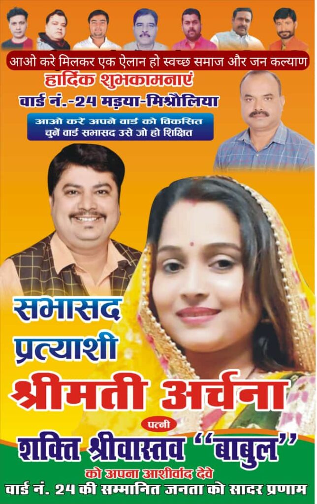 संत कबीर नगर ।। 20 अप्रैल 2023,स्थानीय निकाय निर्वाचन में नगर पालिका खलीलाबाद से वार्ड न 24 मड़या मिश्रालिया से सभासद प्रत्याशी अर्चना पत्नी शक्ति श्रीवास्तव बाबुल ने किया नामांकन किया गया,