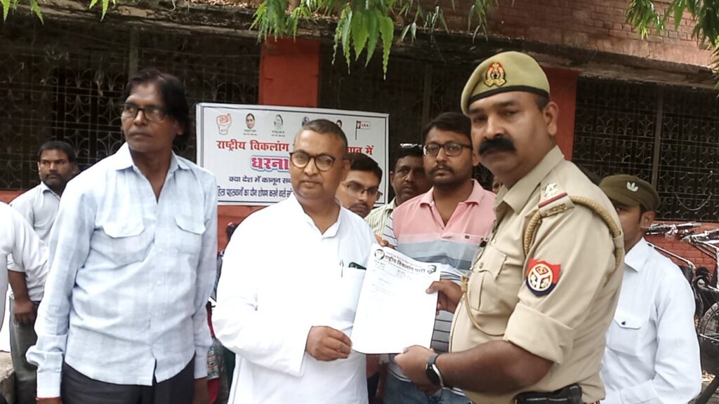 कानपुर| राष्ट्रीय विकलांग पार्टी ने आज शास्त्री नगर सेन्टर पार्क मे संजीवा द्वारा लिखित गीत मन की बात भाड में जाये, अच्छे दिन की ऐसी तैसी, बेटियाँ सुरक्षित कर न सको तो छोड़ दो कुर्सी के नारों के साथ देश की आन बान शान बढाने वाली बेटियों के समर्थन में आज धरना देकर महामहिम राष्ट्रपति के नाम सम्बोधित ज्ञापन एस०एच०ओ० विनय शर्मा को सौंपा|धरने को सम्बोधित करते हुए पार्टी के राष्ट्रीय महासचिव वीरेन्द्र कुमार ने कहा की देश कठिन दौर से गुजर रहा है| बहन बेटियो की सुरक्षा की जिम्मेदारी उठाने वाले ही उनका शोषण व उत्पीड़न कर रहे है| देश में अब धर्म व जाति देखकर दोषियों के विरूद्ध कार्यवाही होती है जो दुर्भाग्यपूर्ण है| उन्होने कहा की दोषी सांसद बृजभूषण सिंह को तत्काल जेल भेजा जाय और निष्पक्ष जांच करवाकर दोषी के विरूद्ध कठोर कार्यवाही हो|