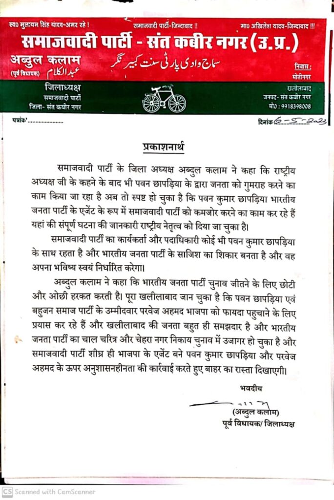 संत कबीर नगर 6 मई 2023 समाजवादी पार्टी के जिला कार्यकारिणी इकाई के जिला अध्यक्ष अब्दुल कलाम द्वारा बागी सपा प्रत्याशी पवन छापरिया और पप्पू बाबू के ऊपर आरोप लगाते हुए कहा है कि राष्ट्रीय अध्यक्ष के नेतृत्व में भरे मंच से उन्होंने सभी समाजवादी पार्टियों से अपनी गलतियों को समझते हुए उसमें सुधार करते हुए उन्होंने कहा था कि जो हुआ वह गलती थी आज इसमें सुधार करते हुए हम सभी समाजवादी पार्टी के निष्ठावान कार्यकर्ता और नेताओं से इस अनुरोध के साथ आप सभी लोग खलीलाबाद नगर पालिका क्षेत्र में चेयरमैन पद के प्रत्याशी जगत जायसवाल को अपना समर्थन देते हुए उनको भारी बहुमत से जिताने का काम करें जिला अध्यक्ष ने बताया कि उक्त बागी प्रत्याशी द्वारा राष्ट्रीय अध्यक्ष अखिलेश यादव के अनुरोध को भी ठुकराते हुए निकाय चुनाव में पूरी तरह से भाजपा प्रत्याशी और बसपा प्रत्याशी के एजेंट के रूप में काम करते हुए अपना प्रचार प्रसार कर रहा है जो आज हम सभी समाजवादी पार्टियों की मीटिंग में पुरजोर निर्णय लिया गया कि ऐसे लोगों के द्वारा किए गए तृत्व को जिला कार्यकारिणी कतई बर्दाश्त नहीं करेगी ऐसे में सभी समाजवादी पार्टी कार्यकर्ता और निष्ठावान वरिष्ठ नेताओं से यह अनुरोध है कि किसी भी तरह का कोई भी समर्थन इस बागी उम्मीदवार पवन छापरिया को न दिया जाए अगर किसी तरह से कहीं से भी किसी प्रकार की कोई शिकवा शिकायत मिलती है तो कार्यकर्ता या नेता के खिलाफ मेरी कार्रवाई की जा सकती है |
