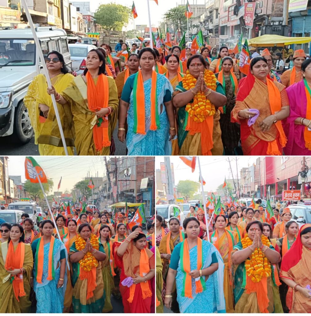 महिला मोर्चा जिलाध्यक्ष रोली सिंह ने कहाँ महिला मोर्चा द्वारा पदयात्रा करके देवतुल्य जनता-जनार्दन से भारतीय जनता पार्टी के चुनाव निशान “कमल के फूल” पर वोट देकर एक बार फिर ट्रिपल इंजन की सरकार बनाने की अपील की गई ।