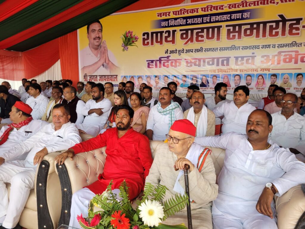 बताते चलें कि स्थानीय नगर निकाय चुनाव में सपा समर्थित निर्दल प्रत्याशी जगत जयसवाल की ऐतिहासिक जीत हुई थी उसी क्रम में उत्तर प्रदेश शासन के निर्देशन के क्रम में खलीलाबाद के उप जिलाधिकारी रमेश चंद्र द्वारा बूंदाबांदी के बीच नवनिर्वाचित खलीलाबाद नगर पालिका के चेयरमैन जगत जायसवाल समेत सभी 25 वार्ड सभासदों को पद और गोपनीयता की शपथ दिलाई गई इस अवसर पर समाजवादी पार्टी के जिला अध्यक्ष अब्दुल कलाम समेत समाजवादी पार्टी के पूर्व लोकप्रिय विधायक दिग्विजय नारायण उर्फ जय चौबे तथा जिला पंचायत अध्यक्ष बलराम सिंह यादव, समाजवादी पार्टी के मेहदावल विधानसभा के कद्दावर प्रत्याशी जयराम पांडे केडी यादव इंदल यादव समाजवादी पार्टी के वरिष्ठ नेता कपिल यादव रामशरण यादव ओमकार यादव ग्राम प्रधान आटा अखलाक अहमद समेत सैकड़ों सपा नेताओं द्वारा अपने नवनिर्वाचित चेयरमैन जगत जयसवाल को फूल मालाओं के साथ स्वागत किया गया इस अवसर पर नवनिर्वाचित चेयरमैन जगत जयसवाल द्वारा शपथ ग्रहण समारोह में उपस्थित सभी गणमान्य नागरिकों का अभिवादन करते हुए कहा कि यह जीत हमारी नहीं हुई है बल्कि यह जनता जनार्दन की जीत है और इसके हम ऋणी हैं, मैं इसको सुद मूर के साथ अपने जनता के विकास के लिए अनवरत कार्य करता रहूंगा क्योंकि जिस तरह से खलीलाबाद की जनता ने मुझे अपने विश्वास के साथ चुना है उसके प्रति में सदैव आप लोगों के सुख सुविधा के लिए अनवरत खलीलाबाद के चौमुखी विकास के लिए कार्य करता रहूगा शपथ समारोह में शामिल हुए विधानसभा पूर्व प्रभारी जनप्रिय नेता रमेश चंद्र यादव पूर्व सांसद सुरेंद्र यादव के पुत्र आलोक यादव और सोनू भैया तथा बादल यादव समेत समाजवादी पार्टी के तमाम कद्दावर नेता व महिला प्रकोष्ठ के जिला अध्यक्ष शकुंतला यादव समेत सैकड़ों महिला सपा नेताओं ने भाग लेकर उत्साहवर्धन किया |