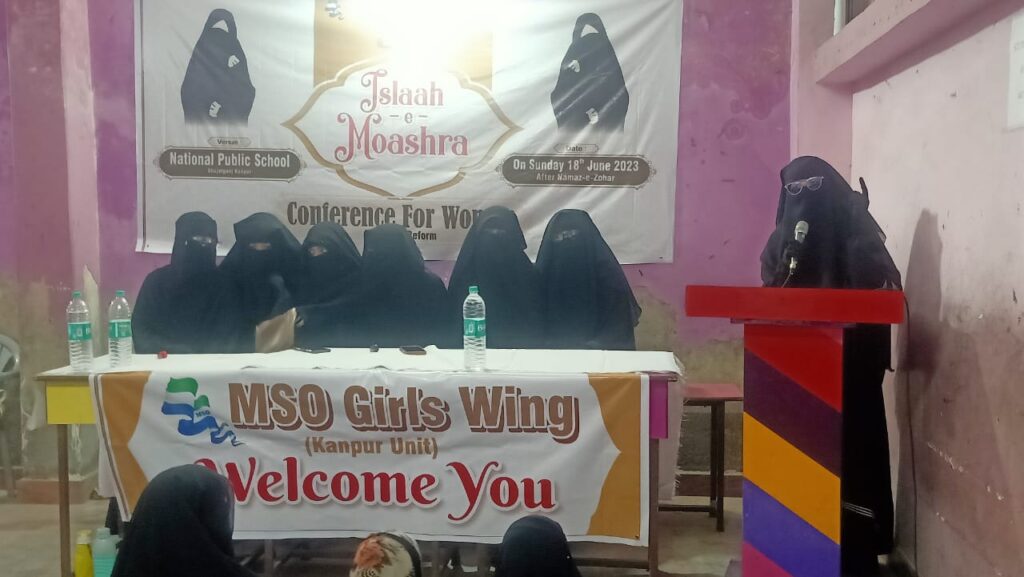 कानपुर- हिन्दुस्तान के सबसे बड़े छात्र संगठन मुस्लिम स्टूडेंट ओर्गेनाईज़ेशन कि कानपुर यूनिट की गर्ल्स विंग ने रविवार को शुजाअत गंज स्थित नेशनल पब्लिक स्कूल में इस्लाह ए मुआशरा कान्फ्रेंस फोर वुमैन का आयोजन किया जिसमें काफी संख्या में महिलाओं ने हिस्सा लिया। प्रोग्राम का आग़ाज़ तिलावत ए कुरआन रब्बानी से हुस्ना फातिमा रज़विया ने किया और प्रोग्राम की अध्यक्षता कानपुर यूनिट की गर्ल्स विंग की प्रेसिडेंट आयशा इस्माईलीया अन्सारी ने की और संचालन वाइस प्रेसिडेंट सादिया कौसर ने किया। नेहा फातिमा रज़विया, सुबिया फातिमा, शिफा अंजुम ने नात शरिफ पड़ी। प्रोग्राम में मेहमाने खुसूसी की हैसियत से रोशन नगर से तशरीफ लायी आलिमा अहलम नसीम साहिबा ने इस्लाम मे औरतों के हुकूक और दौरे हाज़िर में अपने बच्चों की तरबियत माँ बाप किस तरह करे इस मौज़ू पर ब्यान किया। इसके बाद हुस्ना फातिमा रज़विया ने ब्यान किया समाज में फैली बुराई और उसका खातमा इस मौज़ू पर ब्यान किया। इसके बाद कानपुर यूनिट गर्ल्स विंग की प्रेसिडेंट आयशा इस्माईलीया अन्सारी साहिबा ने ब्यान किया और लड़कियों की तालीम पर ज़ोर देते हुये कहा कि माँ बाप लड़कियों को दीनी और दुन्यावी दोनों तालीम दे लड़कियां हिजाब में रहकर शरियत की पाबन्दी के साथ दोनों तालीम हासिल करे और अपना मुस्तकबिल सवारें। कानपुर यूनिट के प्रेसिडेंट मुहम्मद वासिक बेग बरकाती ने आयी हुई सभी ख्वातीन का शुक्रिया अदा किया इसके बाद सलातो सलाम पड़ा गया और मुल्क की खुशहाली, भाईचारगी और सलामती की दुआ कि गई और प्रोग्राम का इख्तेताम हुआ। प्रोग्राम में मुख्य रुप से अदीबा जबीं, फिज़ा खान, सुबिया फातिमा, हुस्ना फातिमा रज़विया, माहिरा फातिमा, नुसरत फातिमा कादरिया, सबा फातिमा रज़विया, नेहा फातिमा रज़विया आदि शामिल रही।