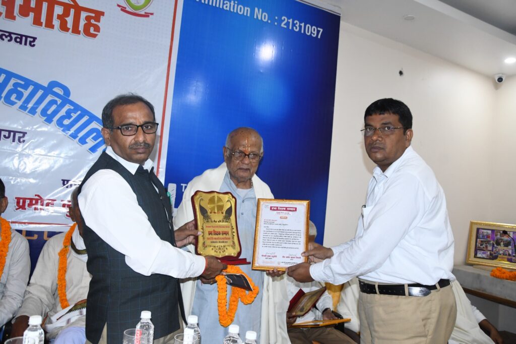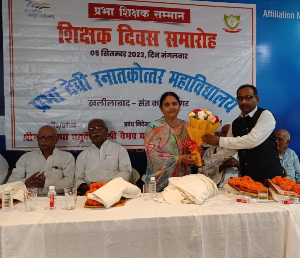 संतकबीरनगर 5 सितंबर 2023। शिक्षक दिवस के अवसर पर प्रभा देवी स्नातकोत्तर महाविद्यालय की प्रबंध निदेशक श्रीमती पुष्पा चतुर्वेदी की अध्यक्षता में शिक्षक सम्मान समारोह का आयोजन किया गया। कार्यक्रम में शिक्षकों को प्रशस्तिपत्र, अंगवस्त्र व पुष्प देकर सम्मानित किया गया। प्रभा देवी स्नातकोत्तर महाविद्यालय में आयोजित कार्यक्रम में प्रबंध निदेशक श्रीमती पुष्पा चतुर्वेदी ने कहा कि डा.राधा कृष्णन ने राष्ट्रपति बनने के बाद अपना जन्म दिन शिक्षक दिवस के रूप में मनाकर शिक्षकों को सम्मानित किया था। शिक्षक दिवस के अवसर पर महाविद्यालय द्वारा पूर्व माध्यमिक, माध्यमिक शिक्षा एवं उच्च शिक्षा के क्षेत्र में सेवा अवधि पूर्ण कर चुके 11 अवकाश प्राप्त आचार्यों का सम्मान किया गया। जिसमें डॉ दिग्विजय नाथ पाण्डेय- पूर्व प्राचार्य जवाहर लाल नेहरू महाविद्यालय महराजगंज, हीरालाल त्रिपाठी- पूर्व प्रधानाचार्य रामकृष्णपरमहंस इन्टर कालेज मुखलिसपुर,आर पी सिंह- पूर्व शिक्षक ब्लूमिंग बर्ड्स स्कूल, राम सरन जायसवाल पूर्व प्रधानाचार्य, नर्मदा पाण्डेय- उदयभान सिंह राम प्रसाद पाण्डेय राम ललित यादव समय देव पाण्डेय ओंकार नाथ पाण्डेय पूर्व प्रधानाचार्य गन्ना विकास विद्यालय जैसे जनपद के वरिष्ठ सम्मानित आचार्य उपस्थित रहे।