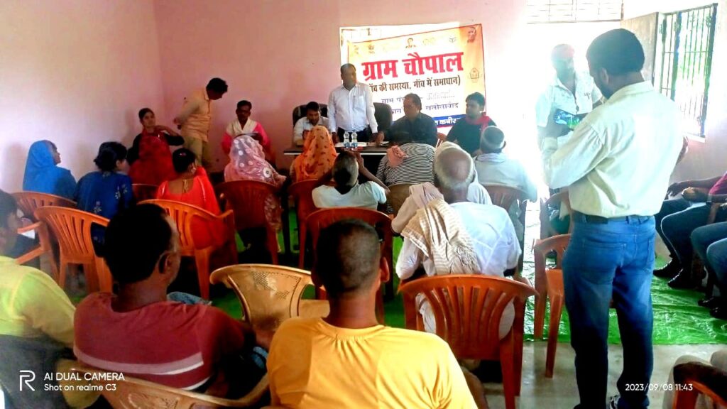 संतकबीरनगर:शासन के निर्देशन के क्रम में खलीलाबाद विकासखंड के अंतर्गत ग्राम पंचायत शिव शंकरपुर में ब्लॉक स्तरीय अधिकारी और कर्मचारी के द्वारा ग्राम चौपाल लगाया गया। जिसमें ग्राम पंचायत से आए हुए लोगों द्वारा किसान सम्मन निधि योजना, वृद्धा पेंशन ,विकलांग पेंशन, विधवा पेंशन ,आवास से संबंधित विभिन्न मुद्दों पर चौपाल में चर्चाएं की गई ।जिसमें ब्लॉक स्तरीय अधिकारी एडीओ आईएसबी अशोक गुप्ता द्वारा ग्रमीणों की समस्या सुनी गई ।जिसमें ज्यादा से ज्यादा मामले पीएम किसान सम्मन निधि योजना के तहत पात्र लाभार्थियों के खाते में समय से पैसा ना आने के मामले ज्यादातर अधिकारियों के संज्ञान में आए । जिसमें एडीओ समाज कल्याण संदीप कुमार चौधरी द्वारा मौके पर उठी तमाम समस्याओं का निदान मौके पर ही कर दिया गया। चौपाल के दौरान लेखपाल अमरनाथ, ग्राम पंचायत अधिकारी कमलेश तिवारी ,संध्या यादव ,आंगनबाड़ी कार्यकत्री सुनीता ,केयरटेकर प्रतिभा सिंह सामुदायिक शौचालय व ग्राम प्रधान आशुतोष कुमार मौके पर उपस्थित रहे।