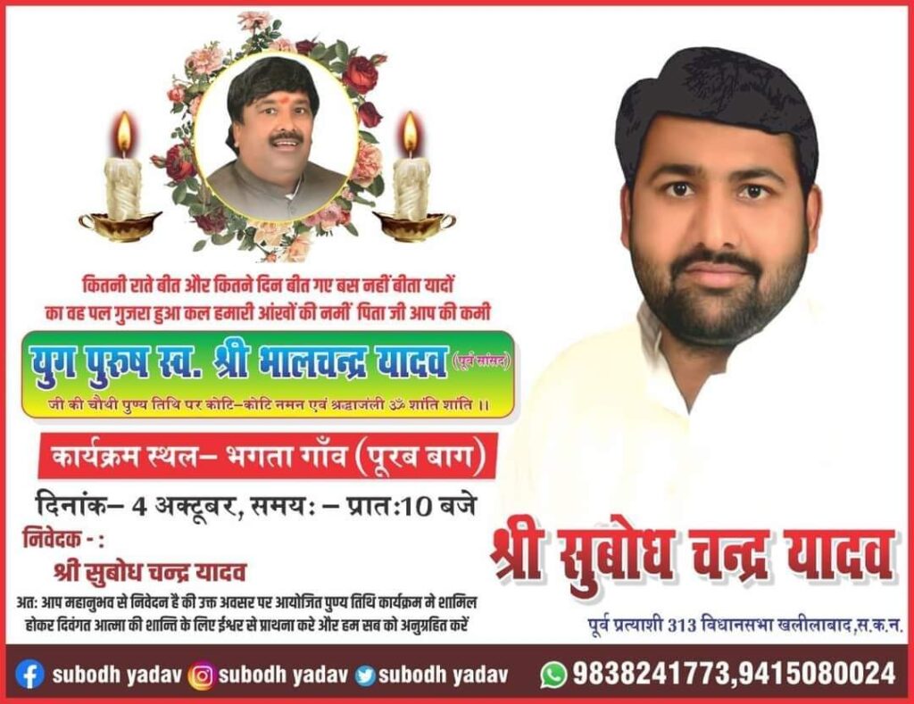 इस अवसर पर स्वर्गीय बालचंद यादव के बड़े भाई लालचंद यादव जी ने जनपद के सभी सम्मानित लोगों के साथ-साथ जनप्रतिनिधियों को अनुरोध के साथ आमंत्रित किया है।क्षेत्र की जनता से उन्होंने कहा कि स्व भालचन्द्र यादव को श्रद्धांजलि सभा मे आवश्य पहुंचे और पुण्यतिथि कार्यक्रम में अपनी गरिमामय उपस्थित दर्ज कराये।