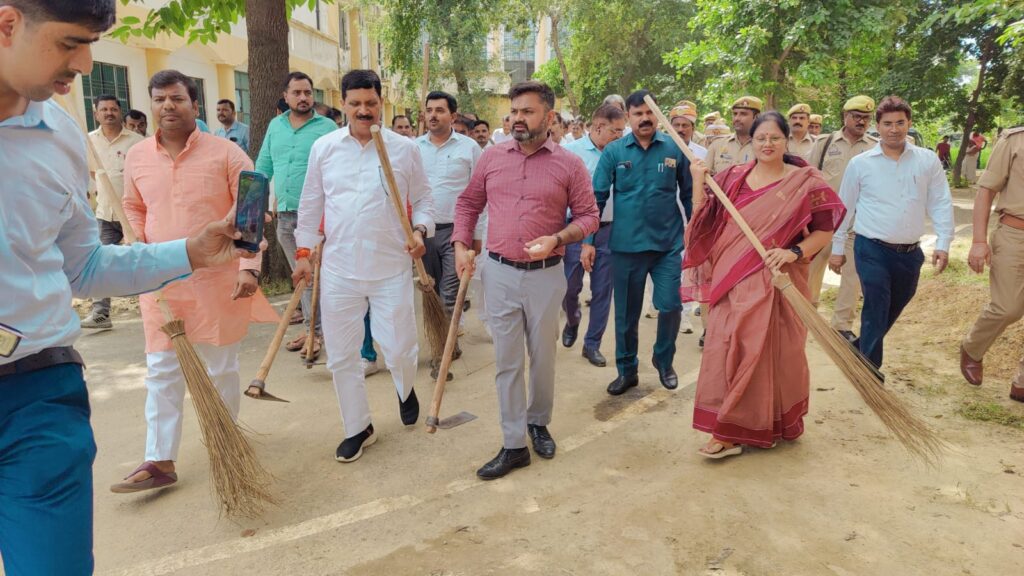 राज्यमंत्री ग्राम्य विकास विभाग एवं समग्र ग्राम विकास, ग्रामीण अभियंत्रण विभाग, उ0प्र0 एवं प्रभारी मंत्री श्रीमती विजयलक्ष्मी गौतम द्वारा झाडू लगाकर स्वच्छता कार्यक्रम में लिया गया हिस्सा, लोगों को स्वच्छता के प्रति किया गया जागरूक