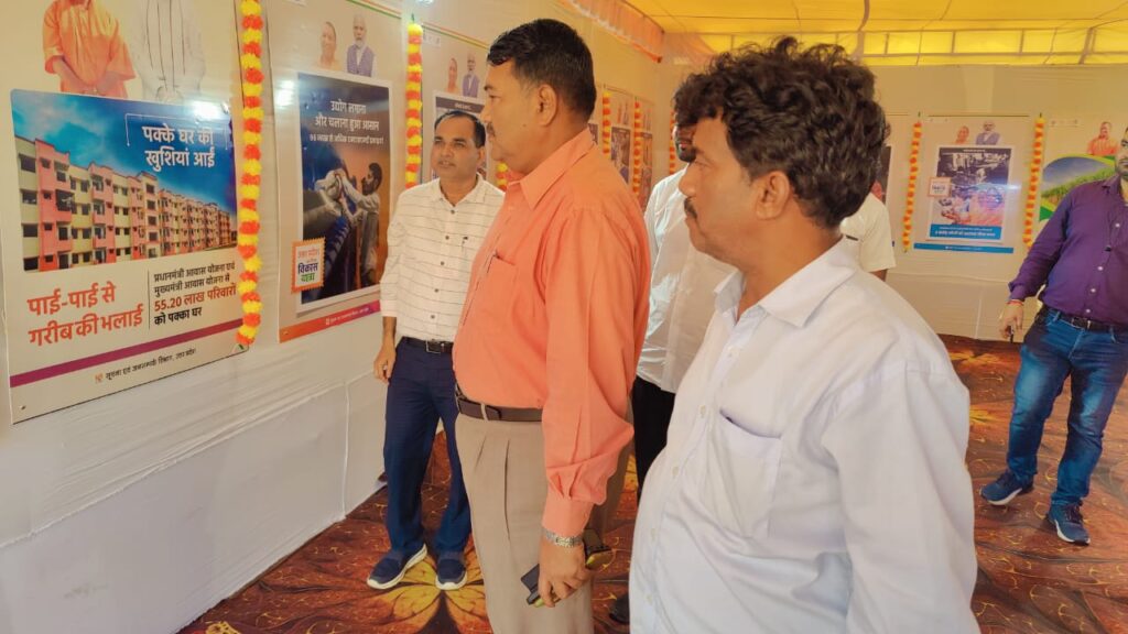 उल्लेखनीय है कि विकास भवन परिसर में प्रदेश सरकार की विकासपरक, लाभार्थीपरक एवं जनहितकारी योजनाओं जैसेः- जल जीवन मिशन-शुद्व जल अब हर घर-द्वार, पीएम स्वनिधि योजना, 06 लाख युवाओं को सरकारी नौकरी, ओडीओपी से हुनरमन्दों को मिला मान-सम्मान, मुख्यमंत्री सामुहिक विवाह योजना, वाइल्ड लाइफ इको पर्यटन, विद्यालयों का कायाकल्प, राज्य विश्वविद्यालयों की स्थापना, थानों में महिला हेल्प डेस्क की स्थापना, मिशन शक्ति अभियान के माध्यम से महिला सुरक्षा, सम्मान एवं स्वालम्बन का अभिनव प्रयास, 01 ट्रिलियन डॉलर की अर्थ व्यवस्था बनने की ओर अग्रसर उत्तर प्रदेश, मुख्यमंत्री कन्या सुमंगला से 16 लाख बालिकाएं सम्मानित, अटल पेंशन योजना के तहत 75 लाख से अधिक लोगो से लाभान्वित करने वाला पहला राज्य बना उत्तर प्रदेश, ई-मार्केटप्लेस जेम पोर्टल के अन्तर्गत सर्वाधिक सरकारी खरीददारी करने वाला पहला राज्य बना उत्तर प्रदेश, मुफ्त दवाई मुफ्त उपचार, एम्स एवं मेडिकल कॉलेजों की स्थापना, कौशल विकास नीति, ईज आफ डूइंग बिजनेस अचीवर स्टेट उत्तर प्रदेश, आई और इलेक्ट्रानिक में अग्रणी राज्य बना उत्तर प्रदेश, 06 एक्सप्रेस-वे संचालित 07 निर्माणाधीन, मिलेट्स-2023 के अन्तर्गत श्री अन्न के प्रोत्साहन हेतु उत्तर प्रदेश मिलेट्स पुनरूद्वार कार्यक्रम संचालित, खेल कोटा के तहत सरकारी नौकरी, 06 शहरों में मेट्रो संचालित, गन्ना एवं चीनी उत्पादन में प्रथम राज्य बना उत्त्र प्रदेश, आयुष्मान भारत व मुख्यमंत्री जनारोग्य योजना में 09 करोड़ लोगो को स्वास्थ्य बीमा कवर, 58 हजार बी0सी0 सखी का चयन, प्रधानमंत्री जीवन ज्योति बीमा योजना में 1.46 करोड़ लोगो को लाभान्वित कर उत्तर प्रदेश देश में प्रथम, 15 करोड़ लोगो को निःशुल्क खाद्यान्न वितरण, प्रधानमंत्री आवास योजना में 55.20 लाख आवासों का निर्माण, प्रधानमंत्री किसान सम्मान निधि योजनान्तर्गत 2.63 करोड़ किसानों को रू0 60845 करोड़ हस्तांतरित, हर घर जल योजना से 1.65 करोड़ के अधिक घरों को नल कनेक्शन, 96 लाख से अधिक एम0एस0एम0ई ईकाईयां, पाई-पाई से गरीब की भलाई, ओलम्पिक विजेताओं का सम्मान, मॉ गंगा काी अविरल-निर्मल धारा के लिए नमान गंगे कार्यक्रम, अपराध एवं अपराधियों के प्रति जिरो टॉलरेंस नीति, 2.61 करोड़ शौचालयों का निर्माण, यूपी ग्लोबल इन्वेस्टर्स समिट में 36 लाख करोड़ रूपये से अधिक के एम0ओ0यू0, 804706 स्वंय सहायता समूहों के माध्यम से 10311982 महिलाओं को रोजगार, डीबीटी के माध्यम से भुगतान करने में उत्तर प्रदेश प्रथम, मनरेगा के क्रियान्वयन में प्रदेश का देश में प्रथम स्थान, दिव्य कुम्भ भव्य कुम्भ, प्रदेश में 03 अर्न्तराष्ट्रीय एयर पोर्ट संचालित, 02 अर्न्तराष्ट्रीय एयर पोर्ट निर्माणाधीन, भव्य-दिव्य राम मंदिर का निर्माण, काशी से हल्दिया तक देश का पहला अ
