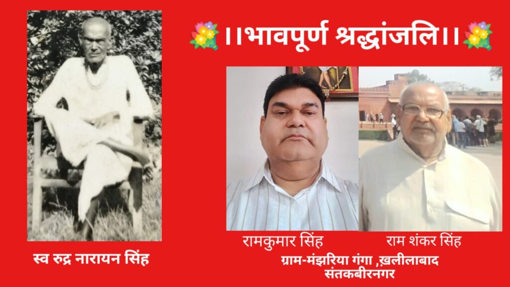 संतकबीरनगर। स्वर्गीय रूद्र नारायन सिंह गृहस्थ जीवन व्यतीत करते हुए भी एक संत थे ये शब्द स्वर्गीय रुद्र नारायन सिंह को भावभीनी श्रद्धांजलि देते हुए उनके छोटे भाई स्व0 मुकुन्द नारायन सिंह के छोटे पुत्र रामशंकर सिंह ने कही। स्वर्गीय रूद्र नारायन सिंह का जन्म ख़लीलाबाद तहसील के देवरिया गंगा गांव में सन् 1898 में हुआ था। शिक्षा दीक्षा के बाद पारिवारिक जिम्मेदारियों के नाते उनकी शादी 14 वर्ष की आयु में ही सन् 1912 में देवरिया जनपद के बरडीहा नामक गांव में हुआ था। परन्तु उनकी धर्म पत्नी शादी के 4 वर्ष बाद ही सन् 1916 में गोलोक वासी हो गयीं है। उक्तक्स अवधि में उनके पास कोई संतान नहीं उत्पन्न हुआ था, वे विचलित होते हुए भी अपने मन को अपने छोटे भाई मुकुन्द नारायन सिंह के बच्चों के साथ लगाकर जीवन यापन शुरू किये। शिक्षा क्षेत्र में बस्ती मण्डल के ख्याति लब्ध अध्यापक माने जाते थे, वे लालगंज में हेडमास्टर के पद पर कार्यरत थे उनके कार्यव्यवहार को देखते हुए सरकार ने एक अतिरिक्त भार वहाँ के “पोस्टमास्टर का” भी दे रखा था, उन्होंने पूरे ईमानदारी एवं कर्तव्यनिष्ठा से दोनों पदों का सकुशल संचालन करते रहे। विद्यालयी शिक्षा देने के साथ ही साथ वे बच्चों को गृहस्थ जीवन का गुरुमंत्र भी बताते रहते थे। परोपकार एवं सेवा उनमें कूट -कूट कर भरा था उनसे मिलने एवं गुरूतर शिक्षा ग्रहण करने हेतु लोग लालायित रहते थे। उनके मुख से हर स्वांस श्रीराम नाम से ही निकलता था पूरा श्री रामचरित मानस कंठस्थ था। समाज सेवा के क्षेत्र में भी उनका कोई सानी नहीं था। उस समय अन्न के संकट रहते थे हर जरूरत मन्द को वे अपने सामर्थ्य एवं आवश्यकता अनुसार अन्न दान भी किया करते थे। असहाय मजबूर एवं ईमानदार व्यक्ति की हर समय सहायता करने को तत्तपर रहते थे। इसी बीच सन् 1954 में उनके छोटे भाई मुकुन्द नारायन सिंह की मृत्यु हो गयी, वे उनके पुत्र बड़े भाई रामकिंकर सिंह एवं खुद मैं रामशंकर सिंह की परवरिस एवं शिक्षा – दीक्षा तथा गृहस्थ आश्रम की सभी आवश्यकताओं को सप्रेम पूरा करते रहते थे, और अपने पुत्र की तरह पालन पोषण करते रहे, कभी यह अहसास नहीं होने दिया कि हमारे सगे पिता नहीं हैं।