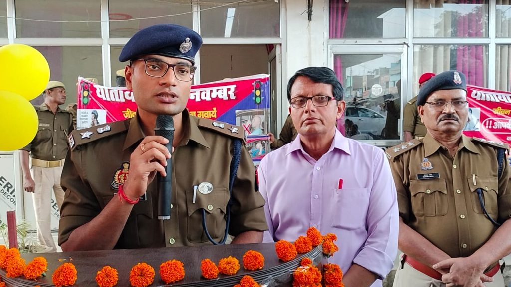 जिलाधिकारी सन्तकबीरनगर 1 नवंबर 2023 जिलाधिकारी महेन्द्र सिंह तंवर* व पुलिस अधीक्षक सत्यजीत गुप्ता* द्वारा क्षेत्राधिकारी यातायात केशवनाथ* की उपस्थिति में यातायात माह नवम्बर 2023 का यातायात कार्यालय मेहदावल बाईपास पर दीप प्रज्वलित कर उद्घाटन किया गया, यातायात जागरुकता रैली को हरी झण्डी दिखाकर रवाना किया गया सड़क पर हो रही दुर्घटनाओं के रोकथाम करते हुए लोगों को यातायात के नियमों के बारें में जागरुक करने, दो पहिया वाहन चलाते समय तीन सवारी न बैठने, बिना नम्बर प्लेट लगी वाहन न चलाने, नशे की हालत में गाड़ी न चलाने, वाहन को ओवर स्पीड़ से न चलाने के साथ लोगों से अपील किया गया की वे अपने परिवार वालों एवं रिश्तेदारों तथा आसपास के लोगों को वाहन चलाते समय हेल्मेट व सीट बेल्ट के प्रयोग करने हेतु प्रेरित करने की भी अपील की गयी । इस अवसर पर प्रभारी यातायात श्री परमहंस व स्कूली बच्चों के अतिरिक्त यातायात के समस्त के अधिकारी / कर्मचारी सहित अन्य सम्मानित जनमानस उपस्थित रहे ।