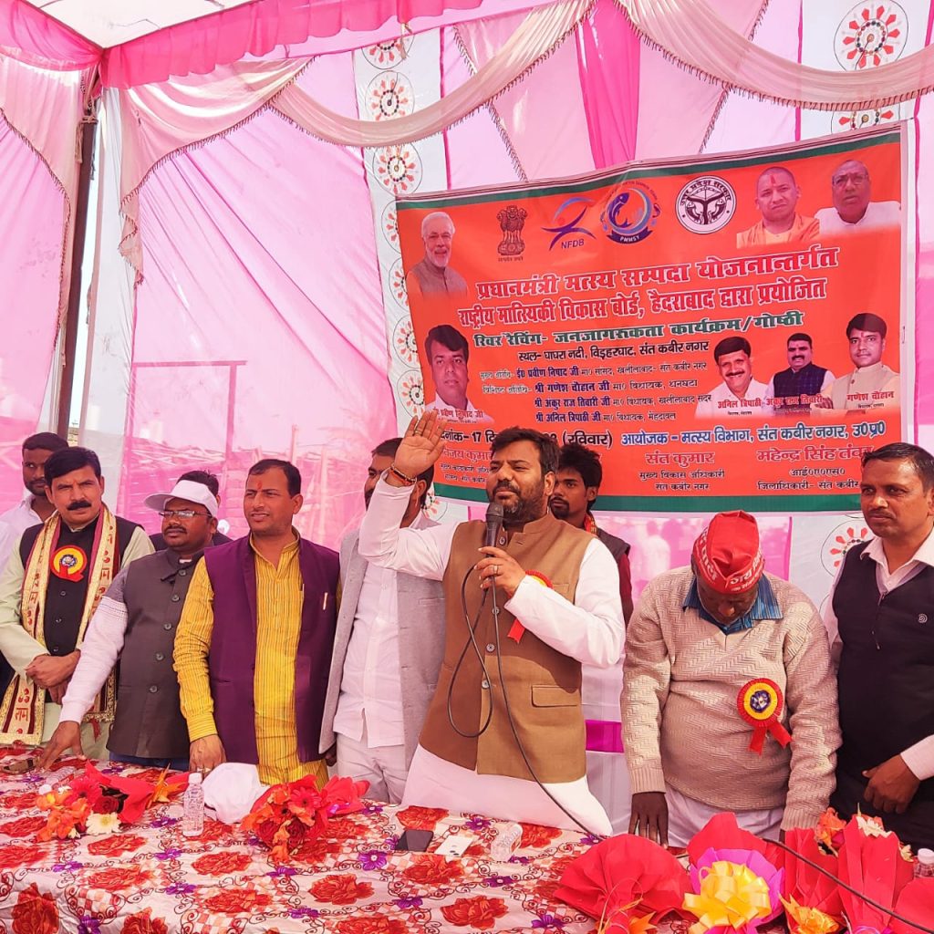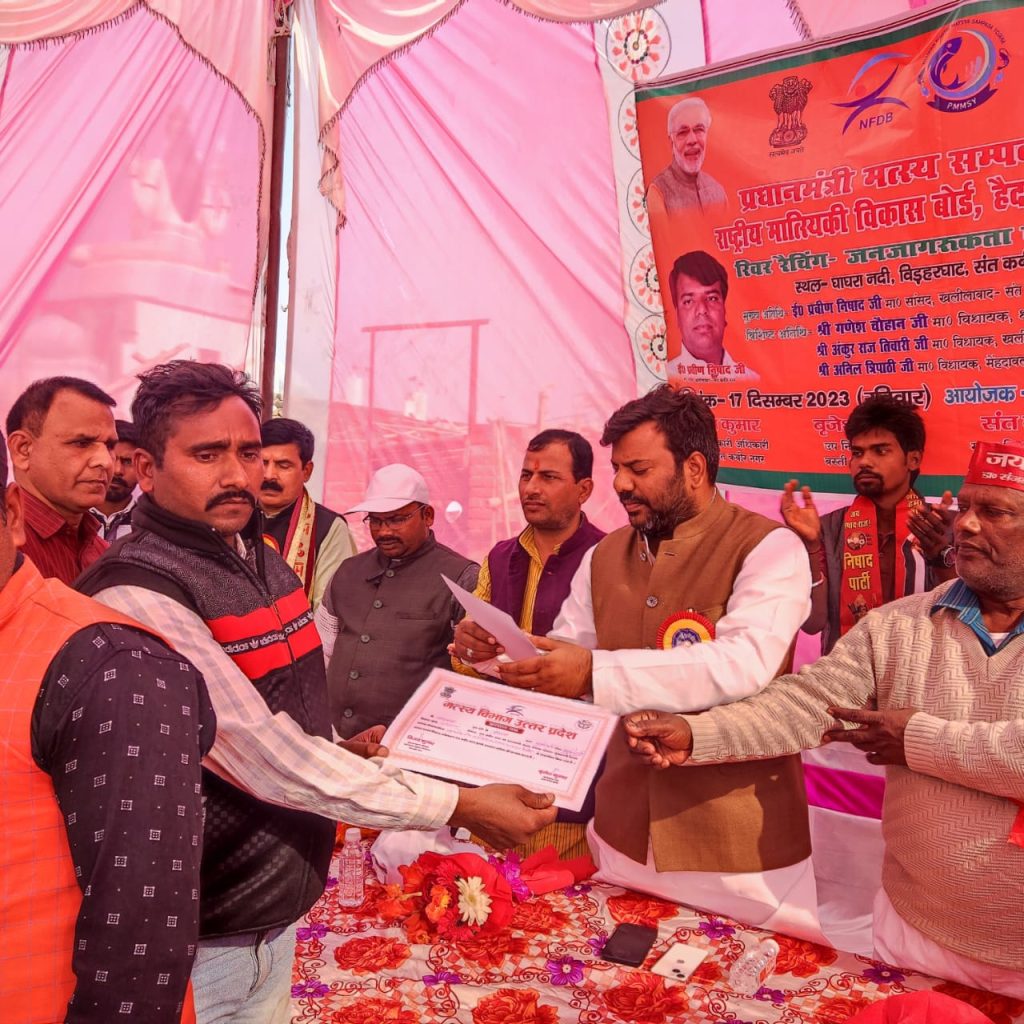 संत कबीर नगर : सांसद प्रवीण निषाद द्वारा प्रधानमंत्री मत्स्य सम्पदा योजना अन्तर्गत जनपद के विकास खण्ड हैसर बाजार के बि डहर घाट ,घाघरा नदी में रिवर रैंचिंग एवम् गोष्ठी कार्यक्रम का आयोजन किया गया। कार्यक्रम का आयोजन मत्स्य विभाग सन्त कबीर नगर के द्वारा किया गया। कार्यक्रम को सम्बोधित करते हुए बतौर मुख्यातिथि सांसद प्रवीण निषाद ने कहा कि जैव विविधता को बढाने व मत्स्य संसाधन को दुरुस्त करने के उद्देश्य से सरकार द्वारा मत्स्य सम्पदा योजना के तहत रिवर रैंचिंग कार्यक्रम का आयोजन किया जा रहा है।इसी क्रम में जनपद के घाघरा के तट पर इसका सफल आयोजन किया जा रहा है। 1.10 लाख मेजर कार्प का बच्चा घाघरा में डाला गया, एवम सांसद द्वारा प्रधानमंत्री मत्स्य संपदा योजना एवं मुख्यमंत्री मत्स्य संपदा योजना में चयनित लाभार्थियो,शकुंतला निषाद,नीलेश निषाद,शीला देवी,प्रेम प्रकाश,जयप्रकाश निषाद,साधुशरण, एवं लाल जी साहनी आदि को अनुदान प्रमाण पत्र सांसद द्वारा दिया गया।इस दौरान विशिष्ट अतिथि के रूप में माननीय जिला अध्यक्ष निषाद पार्टी रामनरेश निषाद, ने कहा कि मछुआ समुदाय के साथ साथ अन्य गरीब व वंचितों के लिए सरकार सतत प्रयत्नशील है।मुख्यमंत्री योगी आदित्यनाथ व कैबिनेट मंत्री डॉ संजय निषाद के द्वारा समाज के अंतिम वर्ग का उत्थान किया जा रहा है।इसके लिए शासन द्वारा विविध जनकल्याणकारी योजनाएं सम्पादित की जा रही हैं।