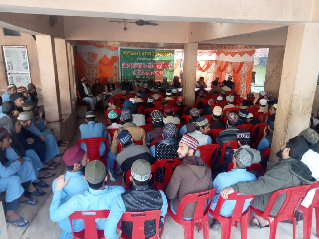 अपनी संस्कृति,अपनी भाषा,अपने संस्थानों और अपने मज़हब को आज़ादी के साथ फरोग देते हैं। इस लिए आज हमारे अल्पसंख्यक छात्रो को संविधान का इल्म(ज्ञान)रखना जरूरी है,ताकि वह अपने अधिकारों को जान कर उनको हासिल करने की कोशिश कर सकें और कोई उनके अधिकारों का हनन ना कर सके।हुकुमते समय-समय पर अल्पसंख्यक समुदाय के लिए जो योजनाएं बनाती हैं उनकी जानकारी हासिल कर के जन जन तक उनको पहुंचाना भी हमारी जिम्मेदारी है। अल्पसंख्यक अधिकार दिवस के मौके पर हम उत्तर प्रदेश मदरसा शिक्षा परिषद और अल्पसंख्यक विभाग लखनऊ से अपील करते हैं कि जिन मदरसों को अब तक मान्यता नहीं मिली है उनको योजनाबद्ध रूप से मान्यता देने का काम जल्द शुरू कर दिया जाए ताकि सबका साथ, सबका विकास और सबका विश्वास वाली नीति का संकल्प पूरा हो। मदरसे के शिक्षक मास्टर कमाल ने कहा कि हमारा संविधान बहुत मजबूत है जिस में अल्पसंख्यको को बहुत अधिकार दिए हैं। मदरसा प्रधानाचार्य मुफ्ती आकिल रज़वी ने कहा कि हम अपने मुल्क के संविधान पर फख्र करते हैं और यह एहसास रखते हैं कि इस संविधान ने हमारे इदारो और औकाफ को तहफफुज दिया है। आज अल्पसंख्यक अधिकार दिवस हम मना रहे है ताकि अपने छात्रो को अपने अधिकारों के संबंध में जागरुक कर सकें। इस कार्यक्रम में मुफ्ती अफरोज आलम,मुफ्ती अय्यूब खान,मुफ्ती मोइनुद्दीन,सय्यद शाकिर अली,मुफ्ती जमील,मुफ्ती कलीमुररहमान,कारी अब्दुल हकीम,मास्टर जुबैर रज़ा खान,मास्टर इरफान,मौलाना अबरारुल हक रहमानी,मोईन खान आदि ने शिरकत की।