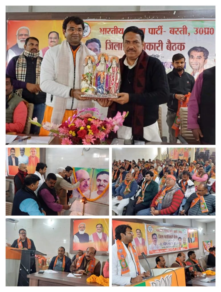 बस्ती जनपद में भारतीय जनता पार्टी के बस्ती मुख्यालय पर सोमवार को पार्टी के जिला पदाधिकारियों, मण्डल अध्यक्षों की बैठक सम्पन्न हुई। पार्टी के जिलाध्यक्ष विवेकानन्द मिश्र की अध्यक्षता एवं प्रदेश महामंत्री गोविन्द नारायण शुक्ल की मौजूदगी में हुई। मंच पर पवन कसौधन, राजेन्द्र गौड़, महेश शुक्ल, प्रेम सागर तिवारी, राजेन्द्र तिवारी, सुशील सिंह, यशकांत सिंह, रवि सोनकर, राजेश पाल चौधरी मौजूद रहे। बैठक में पार्टी के आगामी कार्यक्रमों एवं अभियानों पर विस्तारपूर्वक चर्चा हुई। बैठक में 27 दिसम्बर को लखनऊ में सम्पन्न हुई पार्टी की प्रदेश कार्यसमिति की बैठक में हुए निर्णयों और आगामी संगठनात्मक कार्यक्रमों को साझा किया गया। आगामी कार्यक्रमों एवं अभियानों के क्रियान्वयन के लिए 5 जनवरी तक सभी संगठनात्मक मंडलो में मण्डल इकाई की बैठकें आयोजित करने का निर्णय हुआ। बैठक का संचालन जिला महामंत्री रामचरन चौधरी ने किया। वही विकसित भारत अभियान के संयोजक अमृत कुमार वर्मा ने यात्रा का रोड मैप प्रस्तुत किया। पार्टी के प्रदेश महामन्त्री व क्षेत्रीय प्रभारी गोविन्द नारायण शुक्ल ने बैठक में उपस्थित पार्टी पदाधिकारियों से कहाँ पार्टी लगातार जन अपेक्षाओं पर खरा उतरते हुए चुनावों में जीत हासिल कर रही है। विकसित भारत संकल्प यात्रा मोदी के विकास की गारंटी की यात्रा है। बैठक मोदी की गारंटी वाली गाड़ी जिस भी मोहल्ले या गांव में जा रही है वहां लोगों का विश्वास बढ़ा रही है। उन्होंने कहा कि प्रदेश की 73 लोकसभा सीटों पर भाजपा पहले भी विजय का परचम फहरा चुकी है और अब हमें लक्ष्य 80 को पूर्ण करना है। इसके लिए हमें निश्चित समयावधि में प्रभावी काम करना है। भाजपा विभिन्न कार्यक्रमों एवं अभियानों के माध्यम से सतत जनता के सम्पर्क में रहती है और यही भाजपा की मजबूती का आधार है लोकसभा चुनाव नजदीक है इसलिए परिश्रम भी अधिक है काम का वर्गीकरण और सबको काम इसी स्ट्रेटेजी पर काम करना है।