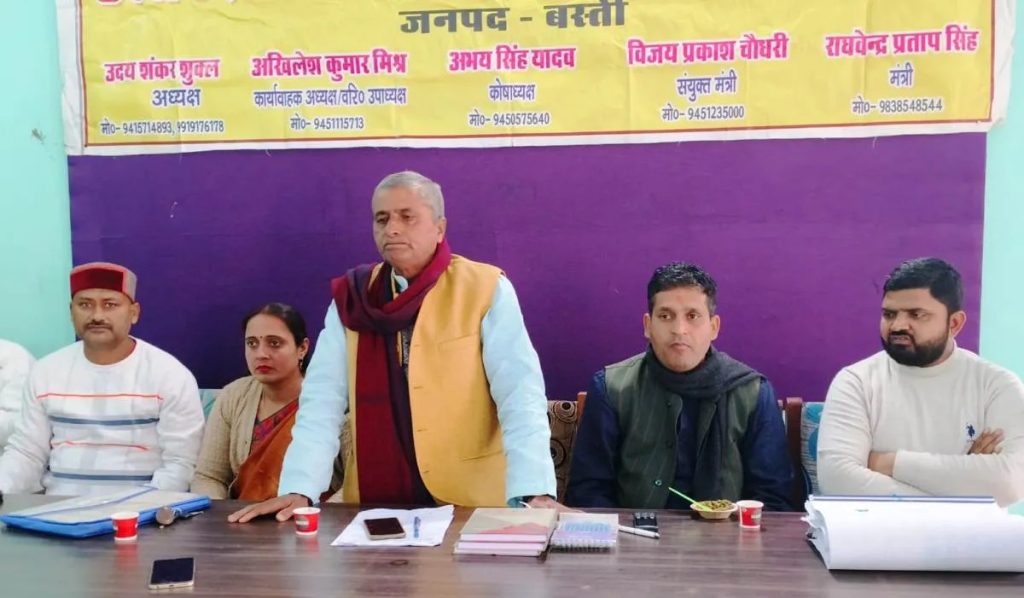 बस्ती जनपद में उत्तर प्रदेशीय प्राथमिक शिक्षक संघ जिलाध्यक्ष उदयशंकर शुक्ल ने सोमवार को प्रेस क्लब सभागार में पत्रकारों से वार्ता करते हुये कहा कि वर्ष 2024 शिक्षकों, केन्द्रीय और राज्य कर्मचारियोें के लिये निर्णायक वर्ष है। पुरानी पेंशन बहाली के लिये हमें पूरी ताकत झोंकनी होंगी तभी यह अधिकार हासिल हो सकेगा। पत्रकारों के सवालों का उत्तर देते हुये संघ जिलाध्यक्ष उदयशंकर शुक्ल ने बताया कि पेंशन बहाली संयुक्त मंच ‘एन.जे.सी.ए.’ राष्ट्रीय नेतृत्व के आवाहन पर आगामी 8 जनवरी को दिन में 10 बजे से जिला बेसिक शिक्षा अधिकारी कार्यालय परिसर में 24 घंटे की भूख हड़ताल शुरू किया जायेगा।, इसमें संघ पदाधिकारी और शिक्षक हिस्सा लेंगे।