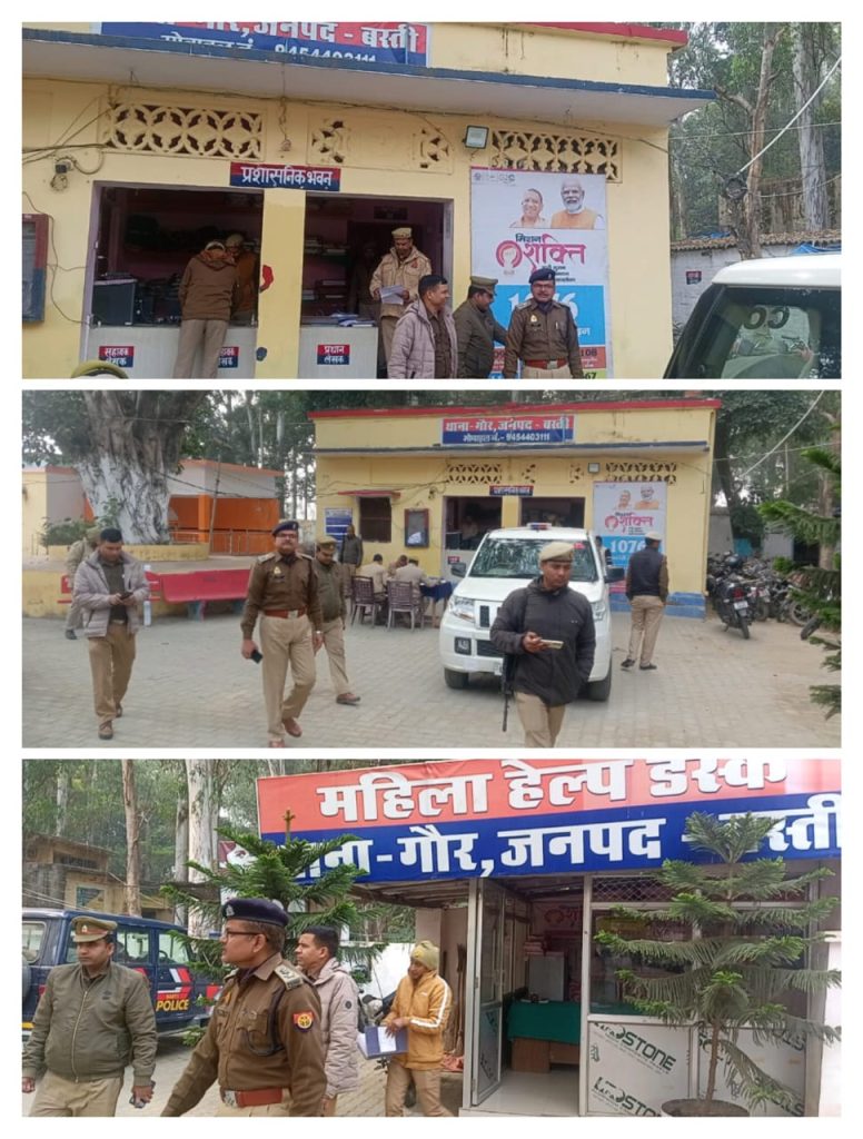 बस्ती जनपद के अपर पुलिस अधीक्षक बस्ती महोदय द्वारा थाना गौर का औचक निरीक्षण किया गया। निरीक्षण के दौरान थाना परिसर, कार्यलय, महिला हेल्प डेस्क, साइबर हेल्प डेस्क, CCTNS कार्यलय, हवालात,मेस,बैरक आदी का निरीक्षण कर अभिलेखो के रख-रखाव व परिसर की साफ-सफाई हेतु संबंधित को आदेशित कर रात्रि गश्त, बैंक चेकिंग आदि के संबंध में प्रभारी निरीक्षक गौर आवश्यक दिशा-निर्देश दिया गया।