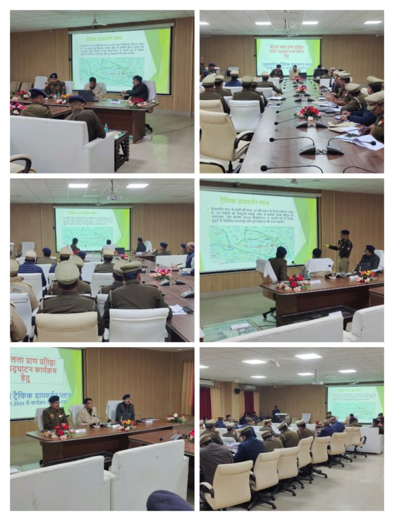 पुलिस लाइन सभागार बस्ती में अपर पुलिस महानिदेशक गोरखपुर ज़ोन, गोरखपुर महोदय द्वारा पुलिस महानिरीक्षक बस्ती परिक्षेत्र, बस्ती महोदय व पुलिस उप महानिरीक्षक देवीपाटन परिक्षेत्र महोदय के साथ आज दिनांक-10.01.2024 को माननीय प्रधानमंत्री भारत सरकार के आगामी अयोध्या आगमन/ भ्रमण के दृष्टिगत सुरक्षा/ शांति/ क़ानून व्यवस्था सुदृढ़ व चुस्त-दुरुस्त बनाए रखने एवं हाइवे व अन्य स्थानों पर रूट डायवर्जन के सम्बन्ध में पुलिस अधीक्षक बस्ती, पुलिस अधीक्षक संतकबीर नगर के उपस्थिति में गोष्ठी की गयी। इस दौरान पुलिस के अन्य अधिकारी/ कर्मचारीगण मौजूद रहे|