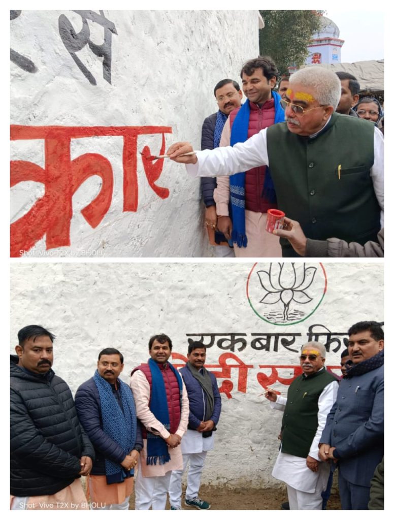 बस्ती जनपद में प्रधानमंत्री जी के आवाहन पर चल रहे स्वच्छता अभियान के अन्तर्गत तिलकपुर मन्दिर पर प्रभारी मंत्री ने साफ सफाई की गई तथा दीवार लेखन अभियान की सुरुआत की। बताते चले कि भाजपा का दीवार लेखन अभियान सोमवार को राष्ट्रीय अध्यक्ष जेपी नड्डा द्वारा शुरू हो गया है। इसी क्रम में प्रभारी मंत्री राकेश सचान व जिलाध्यक्ष विवेकानन्द मिश्र ने अभियान की शुरुआत तिलकपुर में दीवार लेखन का शुभारंभ किया। उन्होंने दीवार पर कमल का फूल बना “फिर एक बार मोदी सरकार का नारा लिखा गया। अभियान अब जिलों में जिलाध्यक्ष के नेतृत्व में शुरू होगा। अभियान को मंडल और बूथ स्तर तक चलाया जाएगा। इसमें भाजपा और केंद्र सरकार की योजनाओं एवं उपलब्धियों को जन जन तक पहुंचाने का काम किया जाएगा।