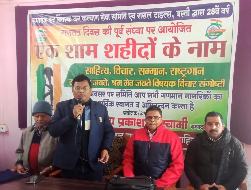 बस्ती जनपद में गणतंत्र दिवस की पूर्व संध्या पर गुरूवार को समाचार पत्र वितरक जन कल्याण सेवा समिति द्वारा प्रेस क्लब सभागार में ‘एक शाम शहीदों के नाम’ कार्यक्रम का आयोजन समिति अध्यक्ष जय प्रकाश गोस्वामी के संयोजन में आयोजित किया गया।मुख्य अतिथि डा० वी०के० वर्मा ने कहा कि आजाद भारत की गणतंत्र यात्रा ने 74 वर्ष पूर्ण कर लिये। अमर शहीदों के सपनों को साकार करना हम सबकी जिम्मेदारी है। भारतीय गणतंत्र अपनी विविधता में निरन्तर चुनौतियों के बीच विकसित हो रहा है। 75 वां गणतंत्र दिवस हमारे अमर शहीदों के सपनों को साकार करे यह हब सबका लक्ष्य होना चाहिये।