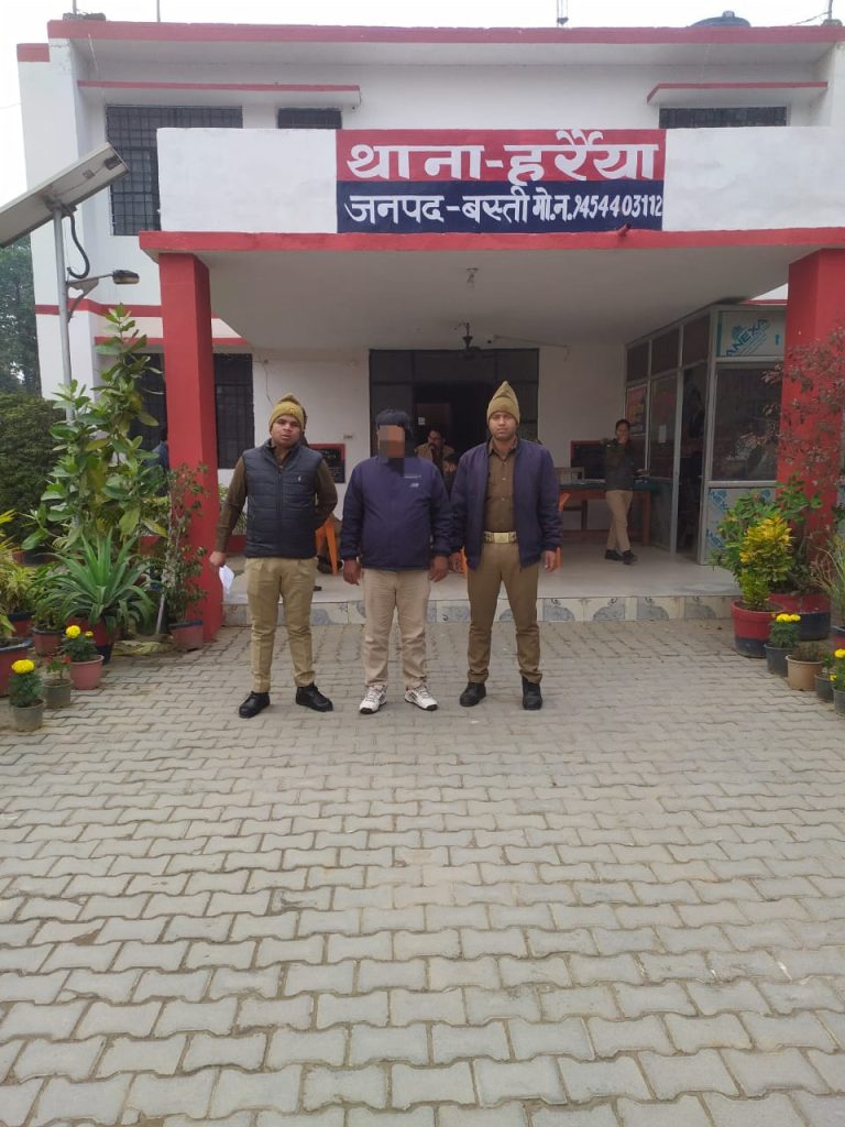 बस्ती जनपद में आज दिनांक 14.02.2024 को प्रभारी निरीक्षक हरैया राणा देवेंद्र प्रताप सिंह के नेतृत्व में थाना हर्रैया पुलिस टीम द्वारा मुकदमा अपराध संख्या 51/23 धारा 279, 304(A), 419, 420, 467, 468, 471 आईपीसी से संबंधित वांछित अभियुक्त को गिरफ्तार कर आवश्यक कार्यवाही करने के पश्चात मा0 न्यायालय भेजा गया।