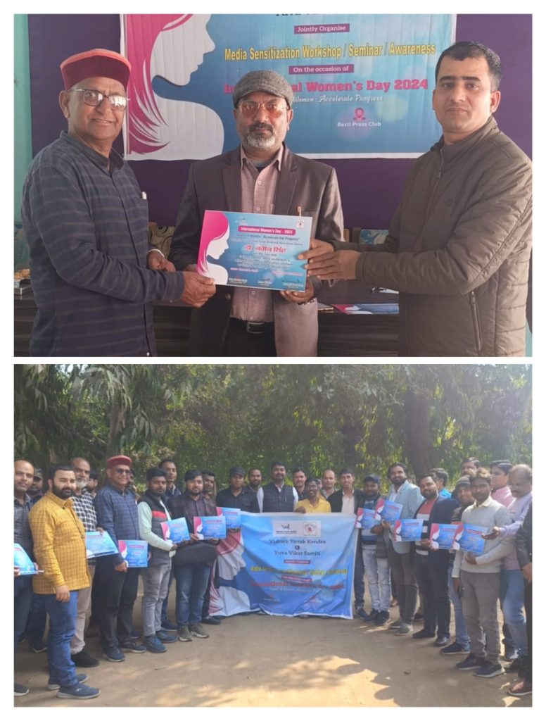 बस्ती: अंतरराष्ट्रीय महिला दिवस सप्ताह के अंतर्गत चलाये जा रहे जागरूकता अभियान के तहत महिलाओं से संबंधित मुद्दों और मीडिया में महिलाओं के चित्रण पर ध्यान केंद्रित करने के लिए ‘मीडिया कर्मियों के लिए क्षमता निर्माण और संवेदीकरण कार्यक्रम’ विषय पर एक कार्यशाला का आयोजन विश्व युवक केंद्र नई दिल्ली और युवा विकास समिति के तत्वाधान में प्रेस क्लब बस्ती में किया गया।