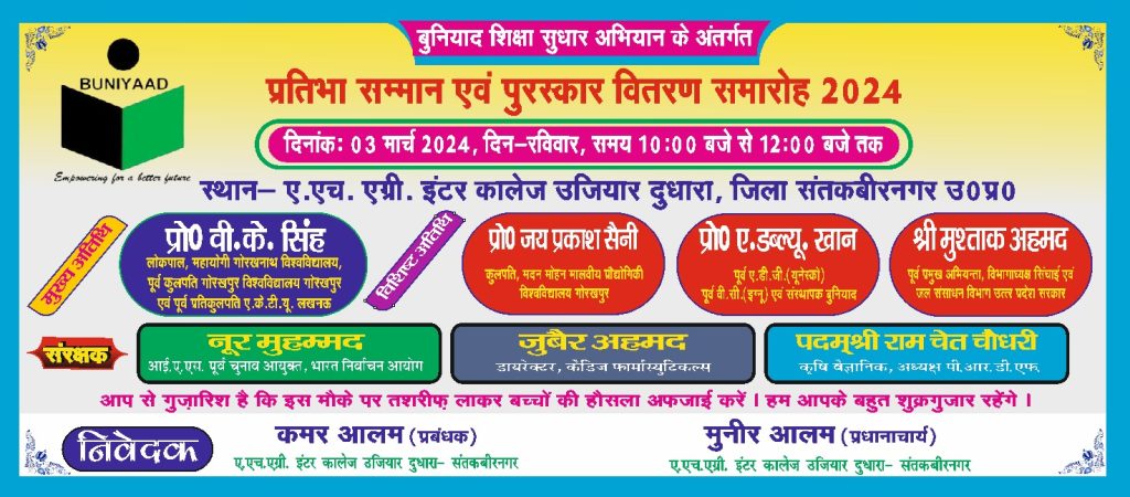 संतकबीरनगर। बुनियाद शिक्षा सुधार अभियान के अंतर्गत विकास खण्ड सेमरियावां क्षेत्र के गांव दुधारा स्थित एएच एग्री. इंटर कालेज उजियार दुधारा में आगामी 3 मार्च को बुनियाद प्रतिभा सम्मान एवं पुरस्कार वितरण