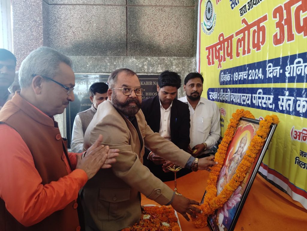 संत कबीर नगर 09 मार्च 2024 जिला विधिक सेवा प्राधिकरण संत कबीर नगर के तत्वाधान में दीवानी न्यायालय परिसर एवं अन्य विभागों में आज राष्ट्रीय लोक अदालत का आयोजन हुआ। मा0 जनपद न्यायाधीश एवं प्राधिकरण के अध्यक्ष अनिल कुमार वर्मा द्वारा मॉ सरस्वती के चित्र पर माल्यार्पण एवं दीप प्रज्जवलित कर राष्ट्रीय लोक अदालत का शुभारम्भ किया गया। मा0 जिला एवं सत्र न्यायाधीश अनिल कुमार वर्मा के निर्देशन में आयोजित राष्ट्रीय लोक अदालत में कुल 23082 मामलों का निस्तारण किया गया। लोक अदालत में बैंक द्वारा कुल 779 मामलों में कुल 47482435 रूपये की ऋण वसूली की गयी। इसी प्रकार न्यायालयों में कुल 2017 मामलों का निस्तारण करते हुए कुल 373730 रूपये का अर्थदण्ड एवं 6125000 रूपये का मोटर दुर्घटना प्रतिकर दिया गया। इसी प्रकार समस्त प्रशासनिक विभागों में 20286 मामलों का निस्तारण किया गया।