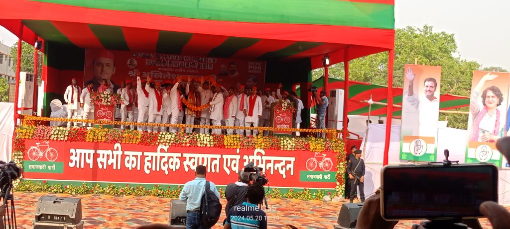 महिलाओं की सुरक्षा को लेकर सरकार गंभीर दिखाई दी। किसान अपना हक मांगने दिल्ली बॉर्डर पर पहुंचे, सरकार ने उनकी एक नही सुनी और न ही बातचीत कर समाधान निकाला। बल्कि किसानों की राह में कील कांटे बिछाये, उन पर लाठियां, रबड़ की गोलियां और वाटर कैनन से पानी की बरसात की। सरकार ने एमएसपी पर बात नही की। अखिलेश यादव ने कहा जनता पूर्ण बहुमत से इंडिया गठबंधन की सरकार बनाने जा रही है। सरकार बनते ही किसानों को एमएसपी की लीगल गारण्टी लागू होगी, किसानों के कर्जे माफ होंगे, कृषि उपकरणों को जीएसटी से मुक्त किया जायेगा। युवाओं की 30 लाख खाली पदों पर भर्ती प्रक्रिया शुरू होगी, एजुकेशन लोन माफ होगा, नौकरियों के लिये किया जाने वाला आवेदन निःशुल्क होगा, और पहली नौकरी पक्की करते हुये युवाओं को 1 लाख रूपया सालाना दिया जायेगा। हर गरीब परिवार की वरिष्ठ महिला को 1 लाख रूपया मिलेगा।