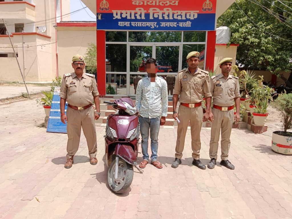 बस्ती जनपद थाना परसरामपुर पुलिस द्वारा थाना स्थानीय पर पंजीकृत मु0अ0सं0 151/2024 धारा 380,411 आईपीसी से सम्बन्धित 01 नफर वांछित अभियुक्त 1- अरविन्द शुक्ला पुत्र कल्लू प्रसाद शुक्ला साकिन सोनरई थाना इकौना जनपद श्रावस्ती उम्र करीब 20 वर्ष को ग्राम मडेरिया तिराहा थाना परसरामपुर से दिनांक 09.06.2024 को समय करीब 11.15 बजे गिरफ्तार किया गया एवं चोरी किया हुआ एक अदद स्कूटी मोटरसाइकिल नं0 यूपी 32 जीपी 7138 बरामद किया गया ।