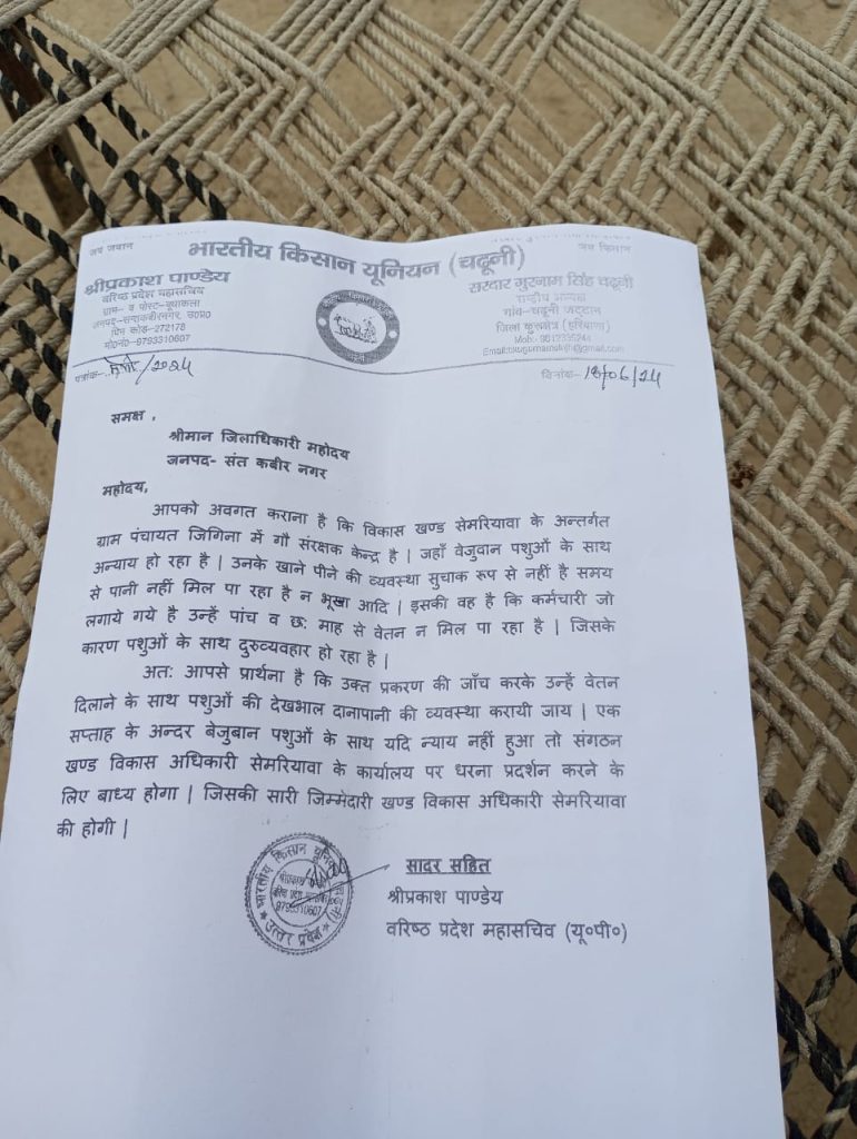 विकास खंड सेमरियांवा के ग्राम सभा जिगिना में गौ संरक्षक केंद्र बना हुआ है जहां बेजुबान जानवर भूसा और पानी के लिए तड़प रहे हैं । भारतीय किसान यूनियन चढ़ूनी के प्रदेश महासचिव श्री प्रकाश पांडे ने जिलाधिकारी को पत्र देकर तत्काल व्यवस्था को दुरुस्त करने के लिए शिकायती पत्र दिया प्रदेश महासचिव ने कहा गौ संरक्षक केंद्र पर जो कर्मचारी लगाए गए हैं उनका 5 से 6 महीने का वेतन भी रुका हुआ है इसको भी तत्काल दिलाया जाए |