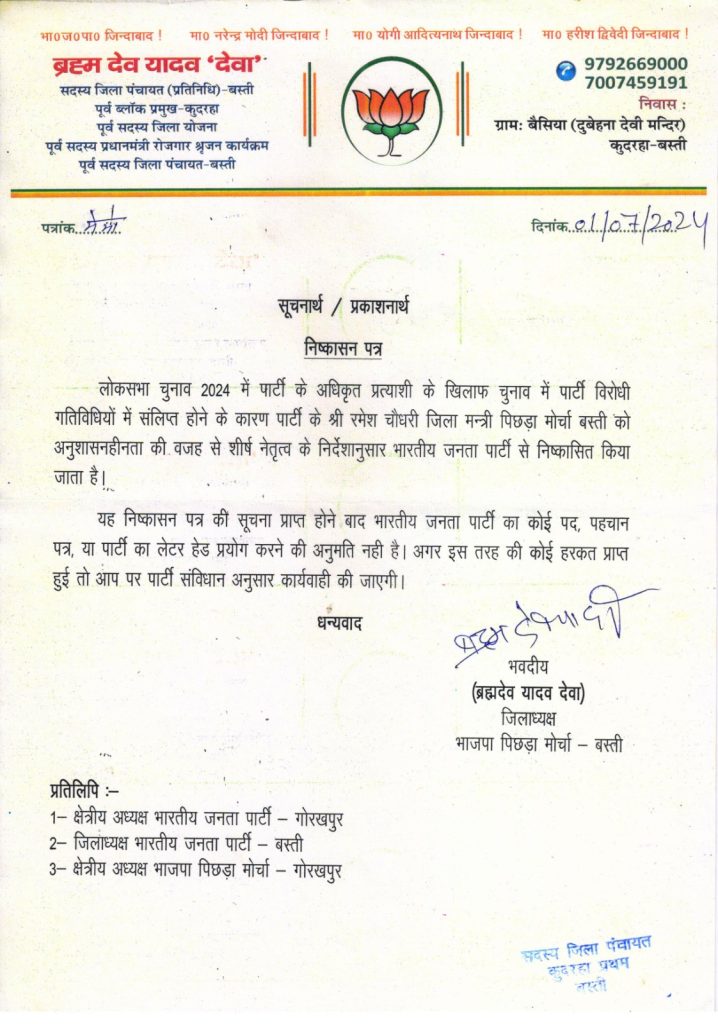बस्ती जनपद लोकसभा चुनाव 2024 में पार्टी के अधिकृत प्रत्याशी के खिलाफ चुनाव में पार्टी विरोधी गतिविधियों में संलिप्त होने के कारण पार्टी के श्री रमेश चौधरी जिला मन्त्री पिछड़ा मोर्चा बस्ती को अनुशासनहीनता की वजह से शीर्ष नेतृत्व के निर्देशानुसार भारतीय जनता पार्टी से निष्कासित किया जाता है।