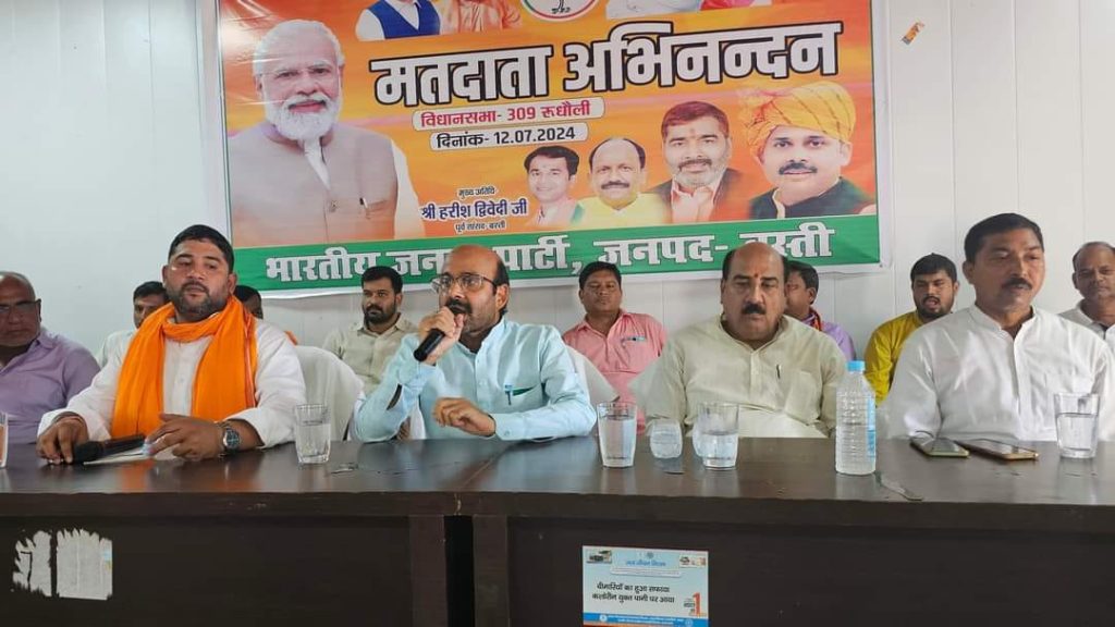 बस्ती जनपद लोकसभा चुनाव परिणाम एवं तीसरी बार नरेंद्र मोदी को प्रधानमंत्री बनाए जाने के बाद भाजपा ने विधानसभा स्तरीय मतदाता अभिनंदन समारोह का आयोजन किया। समारोह के दौरान भाजपा कार्यकर्ताओं और मतदाताओं को माल्यार्पण कर सम्मानित किया गया। भाजपा नेता अमृत कुमार वर्मा ने बताया की बस्ती लोकसभा चुनाव में भाजपा को सफलता नही मिली इसके बावजूद भी भाजपा अपने वोटरों को सहेजने में कोई कसर नही छोड़ना चाहती। बस्ती लोकसभा चुनाव में भाजपा को कुल लगभग 4 लाख 26 हजार वोट मिले। इन वोटरों का सम्मान करने के लिए भाजपा विधानसभा वार मतदाता अभिनन्दन समारोह का आयोजन कर रही है। दो दिवस में प्रस्तावित यह कार्यक्रम 12 जुलाई को विधानसभा रुधौली के सल्टौआ ब्लाक सभागार में, कप्तानगंज में बभनान बाजार, हर्रैया में ब्लाक सभागार में संपन्न हुआ, 13 जुलाई को बस्ती सदर में अटल बिहारी प्रेक्षागृह बस्ती और महादेवा विधानसभा के शिक्षा शक्ति मैरेज हाल कुदरहा में होना है। भाजपा कार्यकर्ताओं और मतदाताओं का लोकसभा चुनाव में दिए गए योगदान को लेकर आभार व्यक्त किया। वरिष्ठ व प्रबुद्ध मतदाताओं को निवर्तमान सांसद हरीश द्विवेदी और जिलाध्यक्ष विवेकानन्द मिश्र ने भगवा अंगवस्त्र पहना कर सम्मानित किया। कार्यक्रम में क्रमवार हजारो मतदाता सम्मानित हुए।