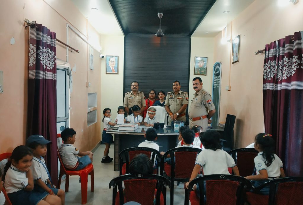 बस्ती जनपद 16.08.2024 को थाना पुरानी बस्ती पर आर.एल.एस.एम.सी इंटरनेशनल स्कूल पाँलिटेक्निक चौराहा की प्रधानाचार्या श्रीमती प्रतिमा सिंह व नेहा उपाध्याय तथा कक्षा UKG के छात्र विराट, सविता, इशा, मुस्तफा, पाखी व अन्य बच्चे उपस्थित आये जिसको थानाध्यक्ष पुरानी बस्ती श्री महेश सिंह द्वारा थाना के कार्यालय, CCTNS कार्यालय, महिला हेल्प डेस्क, मालखाना, हवालात के बारे मे बताया गया तथा बच्चों द्वारा पूछे गए सवालों का उचित जवाब दिया गया तथा UKG के छात्रों में से एक छात्र विराट को थानाध्यक्ष की कुर्सी पर बैठाकर थानाध्यक्ष बनाया गया इस मौके पर बच्चों द्वारा थानाध्यक्ष को विद्यालय की तरफ से स्वयं द्वारा बनाया गया THANK YOU कार्ड दिया गया । इस उपलक्ष्य पर वरिष्ठ उप निरीक्षक एखलाक अहमद, उपनिरीक्षक महेंद्र कुमार, उप निरीक्षक शैलेंद्र शुक्ला ,उप निरीक्षक आशुतोष शुक्ला सहित पुलिस बल उपस्थित रहे।