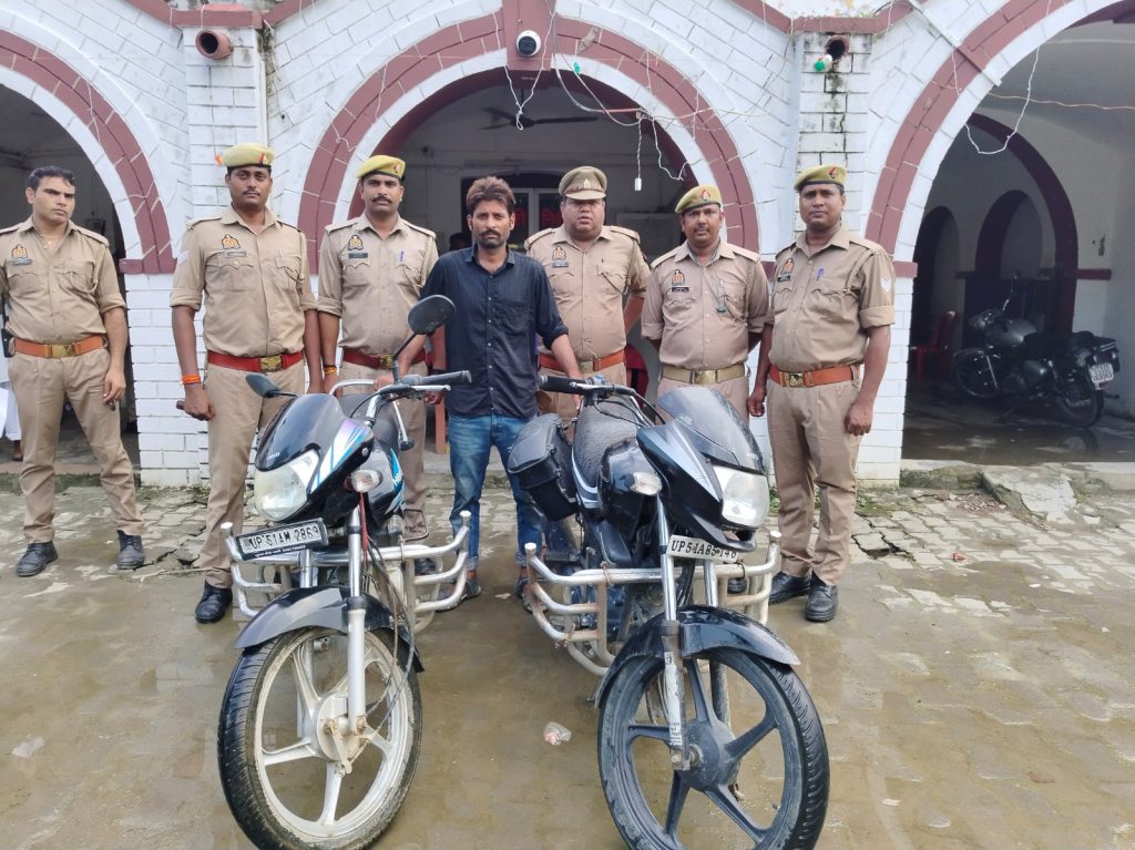 घटना/पूछताछ का संक्षिप्त विवरण पूछताछ में अभियुक्त उदय प्रताप सिंह उर्फ मण्टू सिंह पुत्र राम किशोर सिंह निवासी पिपरा गौतम तिनभरिया पट्टी थाना नगर जनपद बस्ती ने बताया कि मै मोटरसाइकिल वाहन नं0 UP58X3085 सुपर स्प्लेण्डर को भदेश्वरनाथ मंदिर के पास से रात में चोरी किया था उसका नम्बर प्लेट तोड़कर UP51AB5146 का नंबर प्लेट लगाकर प्रयोग कर रहा था । मै और सुनील चौधरी पुत्र जय प्रकाश चौधरी उर्फ गोली निवासी पेड़रिया थाना हर्रैया जनपद बस्ती के साथ मिलकर इस चोरी को अंजाम दिया हूँ हम लोग मिलकर मोटरसाइकिल चोरी करते हैं हम लोग मिलकर कचहरी बस्ती से दिनांक 18.07.2024 को एक मोटरसाइकिल एच0एफ0 डीलक्स UP51M2869 चुराये थे जिसे अगई भगाड़ गाँव के बाहर बने पुलिया में छुपाया हूँ यदि आप लोग साथ चले तो बरामद करा सकता हूँ । पकड़े गये व्यक्ति उदय प्रताप सिंह उर्फ मण्टू के साथ बताये गये स्थान अंगई भगाड़ गाँव के बाहर बने पुलिया पर पहुँचकर उदय प्रताप सिंह उर्फ मण्टू के निशादेही पर UP51AM2869 मोटरसाइकिल एच0एफ0 डीलक्स बरामद किया गया ।