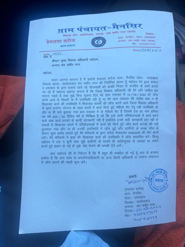 दरअसल, खलीलाबाद विकास खंड के ग्राम पंचायत मैनसिर के राजस्व गांव मैनसिर के ग्रामीण श्याम बिहारी पासवान ने आइजीआरएस पोर्टल पर 26 जनवरी 2024 को शिकायत की थी । इसमें उल्लेख किया था कि गांव के प्रधान अपने परिवार का मनरेगा जॉब कार्ड बनवाए हैं ऐसा करके वह फर्जी भुगतान ले रहे हैं । जिसकी जांच पूर्व में तत्कालीन बीडीओ और उपायुक्त श्रम रोजगार ने की थी लेकिन, जांच रिपोर्ट से शिकायतकर्ता संतुष्ट नहीं थे । इस मामले में सीडीओ जयकेश त्रिपाठी ने शिकायत को पुनः जिला विकास अधिकारी सुरेश चंद्र केसरवानी से शिकायती पत्र में इंगित बिंदुओं की जांच कर आख्या मांगी । महिला प्रधान हेमलता सरोज का आरोप है कि 14 अगस्त को जिला विकास अधिकारी व अन्य सदस्य ग्राम पंचायत में आए थे जहां उन्होंने मेरी गैरमौजूदगी में हमारे लोगों से पूर्व की जांच आख्या को गलत बताए और जांच रिपोर्ट लगाने के बदले में पांच लाख रुपये की मांग किए । चूकिं, मेरे कार्यकाल से पूर्व में तत्कालीन मैनसिर प्रधान द्वारा जॉब कार्ड मेरे रिश्तेदार का नाम पर बनाया गया था वहीं, इन जॉब कार्डधारकों मसलन शिकायतकर्ता श्याम बिहारी पासवान के बिंदु में शामिल लोगों से धनराशि की रिकवरी कराई जा चुकी है । जबकि, वह पूर्व में मनरेगा एक्ट अधिनियम के तहत काम करके अपनी मजदूरी का भुगतान ले रहे थे । बताया कि मेरे द्वारा जब रुपये देने से डीडीओ को मना कर दिया गया तो वह इससे नाराज हो गए और उन्होंने पूर्व की जांच रिपोर्ट को दरकिनार कर दिया । इसके बाद नए सिरे से जांच आख्या बनाकर मेरे खिलाफ रिपोर्ट लगा दिया। सिर्फ इतना ही नहीं सचिव व महिला मेट अनीता को भी धमकी दिए । महिला प्रधान हेमलता सरोज ने कहा कि जिला विकास अधिकारी व उनकी टीम के लोगों ने अपनी रिपोर्ट में जिन लोगों के नाम का जिक्र किया गया है उन लोगों से ना तो बातचीत की गई है और न ही उन्होंने कोई बयान दिया है । ऐसे में मेरे खिलाफ मनगढ़ंत तरीके से रिपोर्ट सीडीओ को प्रेषित किया गया है । उन्होंने कहा कि इस मामले में हमने जिला अधिकारी से निष्पक्ष तरीके से किसी अन्य जिला स्तरीय अधिकारी से जांच करने की मांग की है ।