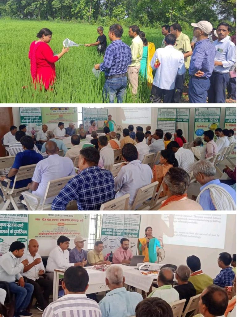 बस्ती जनपद/गोरखपुर भारत सरकार, क़ृषि एवं किसान कल्याण मंत्रालय के अधीन वनस्पती संरक्षण, संगरोध एवं संग्रह निदेशालय के तत्वाधान में जैविक भवन, गोरखपुर में आई पी एम पर दो दिवसीय उन्मुखीकरण प्रशिक्षण कार्यक्रम (खरीफ 2024-25) का शुभारंभ दिनांक 30.08.24 को किया गया. कार्यक्रम का विधिवत उद्घाटन क़ृषि रक्षा अधिकारी (बस्ती ) रतन शंकर ओझा एवं विशिष्ट अतिथि हरेंद्र प्रसाद, उप संभागीय क़ृषि प्रसार अधिकारी द्वारा द्वीप प्रज्वलित कर किया गया . कार्यक्रम के तकनिकी सत्र की शुरआत केंद्र के प्रभारी अधिकारी राजेंद्र कुमार द्वारा आई पी एम पर संछिप्त टिपन्नी द्वारा किया गया एवं उन्होंने मित्र कीट व शत्रु कीट के पहचान एवं उसकी उपयोगिता पर प्रकाश डाला. इस सन्दर्भ में केंद्र के वैज्ञानिक कुमारी जयंती ने कीटनाशकों का मनुष्य पर होने वाले दुशप्रभाव के विषय में जानकारी दी. केंद्र के वैज्ञानिक सुश्री श्वेता श्री ने ट्राईकोडर्मा के उत्पादन एवं इसके प्रयोग के विषय में विस्तृत जानकारी दी. फसलों में लगने वाले उकठा, जड़ सडन आदि रोगों एवं उसके प्रबंधन पर व्याख्यान दिया. इस कार्यक्रम के दौरान वैज्ञानिक रत्नेश मिश्रा व जटा शंकर पाण्डेय ने क़ृषि पारास्थितकी तंत्र के विषय में बताया साथ ही साथ राज्य सरकार के कर्मचारियों व कीटनाशक डीलरों एवं प्रगीतिशील किसान के साथ धान के खेतो में जाकर मित्र एवं शत्रु कीटो की पहचान करवाई. केंद्र के वैज्ञानिक मोनल कुमार सिंह ने आई पी एम एवं इसके घटकों के महत्त्व पर प्रकाश डाला एवं विभिन्न कीटों से होने वाले नुकसान एवं उसके प्रबंधन पर चर्चा की व भारत सरकार के एनपीएसएस ऐप के बारे में जानकारी दी .केंद्र के वैज्ञानिक श्री जटा शंकर पाण्डेय व वरिष्ठ तकनिकी अधिकारी श्रीमती पूनम वर्मा ने केंद्र द्वारा उत्पादित विभिन्न जैव करकों के विषय में विस्तृत जानकारी दी.इस दौरान केंद्र के अन्य कर्मचारीगण , जय प्रकाश सिंह, अजय प्रकाश उपस्थित रहे।