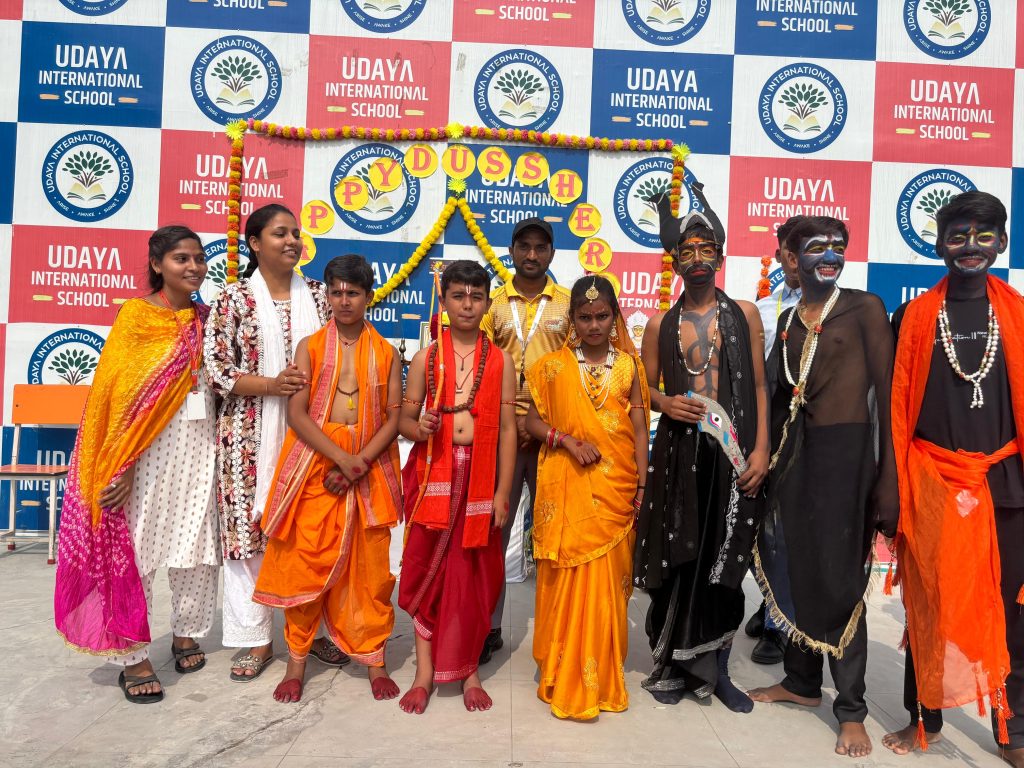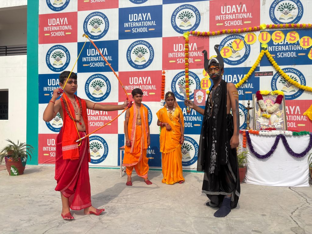 संत कबीर नगर 11 अक्टूबर 2024 उदया इंटरनेशनल सीनियर सेकेंडरी स्कूल भुजैनी में दशहरा पर्व बड़े धूमधाम से मनाया गया। इस मौके पर नन्हे मुन्ने बच्चों ने परिधान के द्वारा भगवान राम और रावण बनकर रामलीला का मंचन किया । बच्चों ने रामलीला के पात्रों के वेश में अपनी लीला से सभी का मन जीत लिया इस मौके पर बतौर मुख्य अतिथि विद्यालय के प्रबंधक आदरणीय पंडित उदय राज तिवारी जी ने सभी बच्चों को बताया कि आज के ही दिन भगवान राम ने रावण का वध किया था , जिसे असत्य पर सत्य की जीत के रूप में मनाया जाता है।