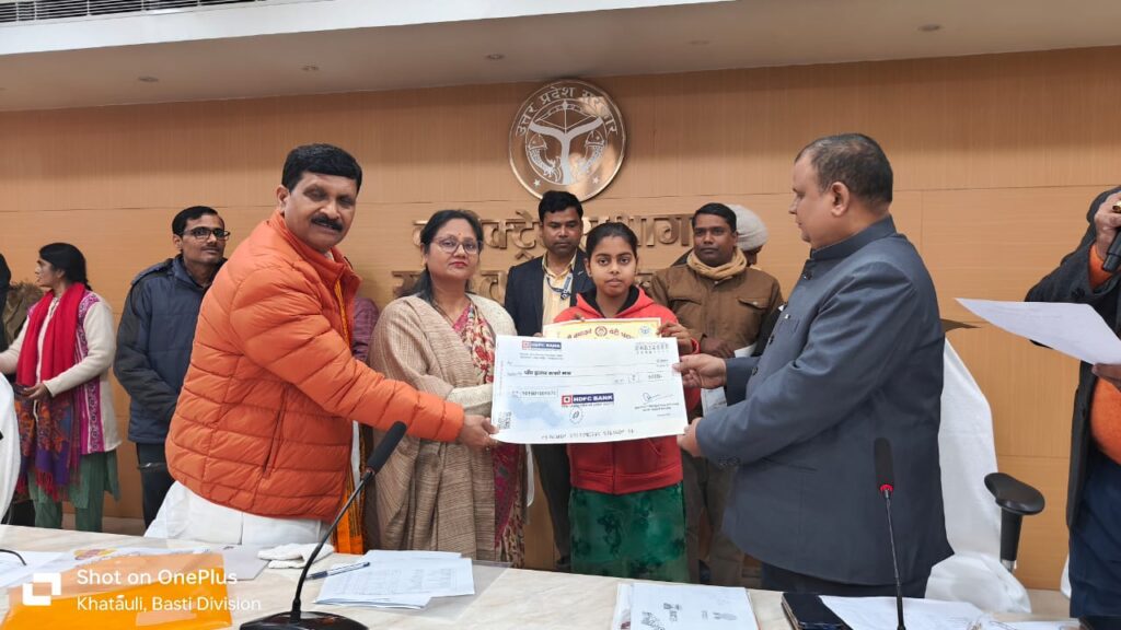 मा0 मंत्री जी द्वारा समीक्षा के दौरान आज राष्ट्रीय बालिका दिवस के अवसर पर बेटी बचाओं बेटी पढ़ाओं योजनान्तर्गत हाईस्कूल एवं इण्टरमीडिएट टॉप 10 में स्थान प्राप्त करने वाली हाईस्कूल के 07 एवं इण्टर 06 की छात्राओं को 05 हजार रूपये का चेक एवं प्रशस्ति पत्र देकर सम्मानित किया गया।